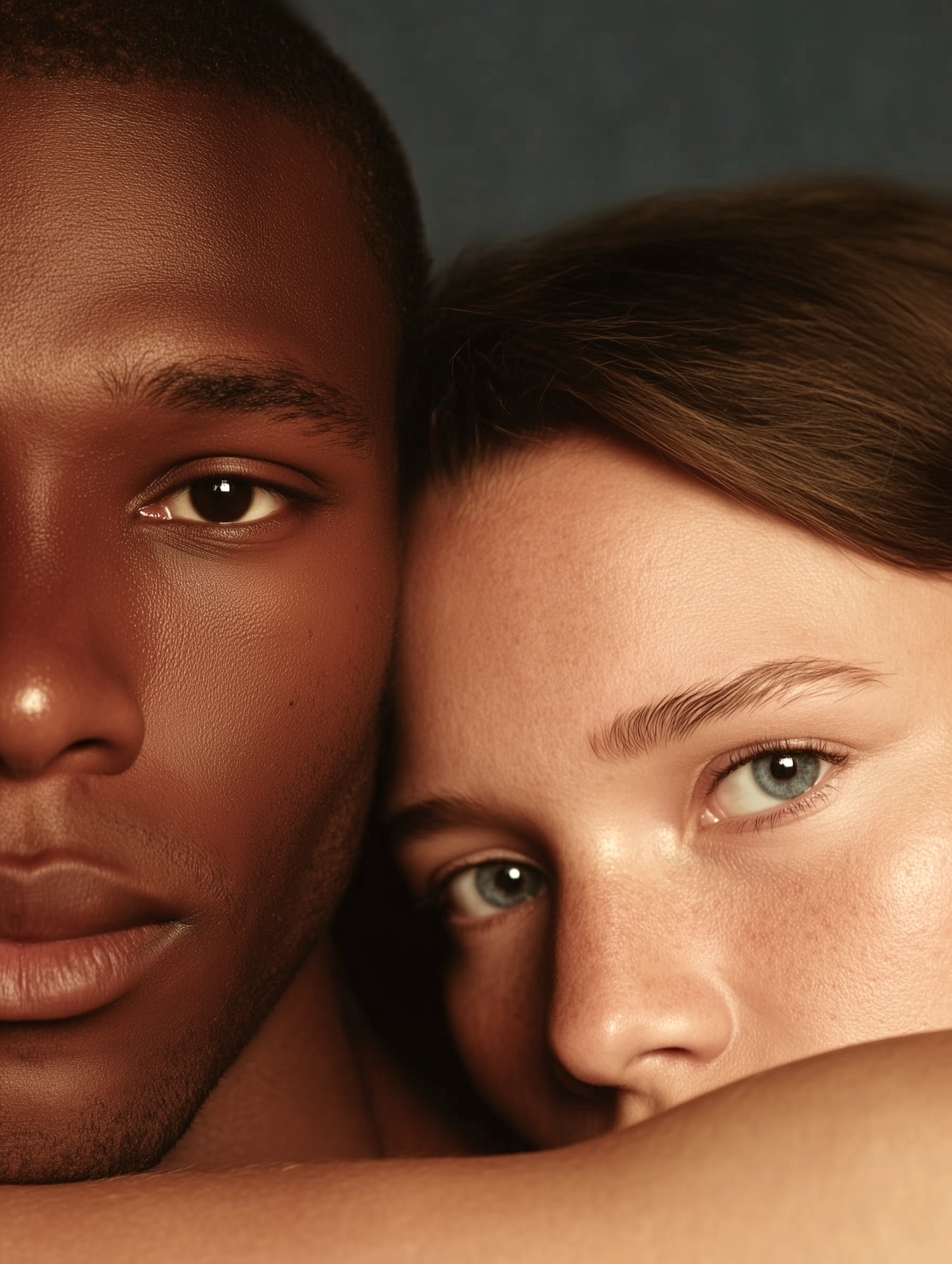 Close-up of two individuals with contrasting skin tones, highlighting their unique features and expressions in a soft, intimate portrait.