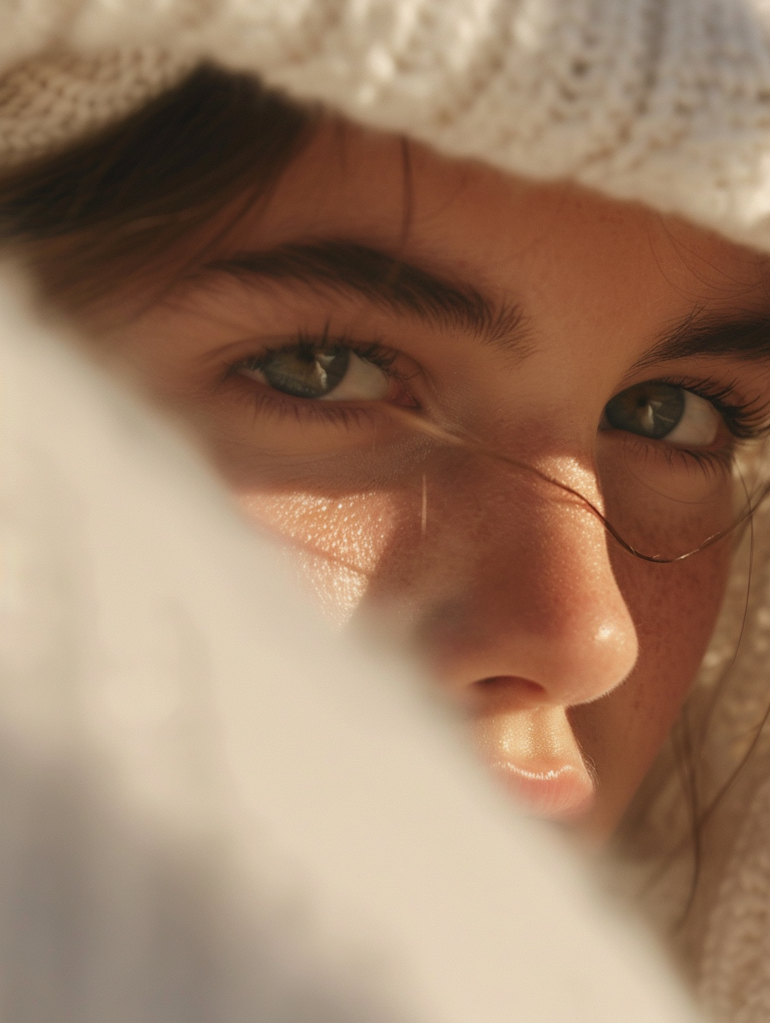 Close-up of a young woman with green eyes and freckles, framed by soft white fabric and warm natural light, creating a serene mood.
