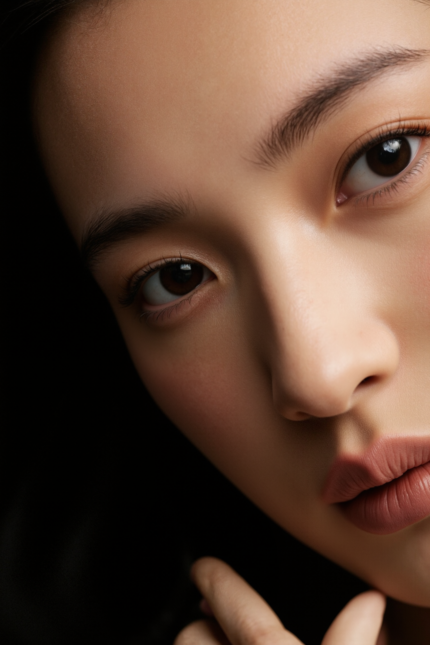Close-up of a young woman with radiant skin, natural makeup, and expressive eyes, highlighting her beauty and elegance.