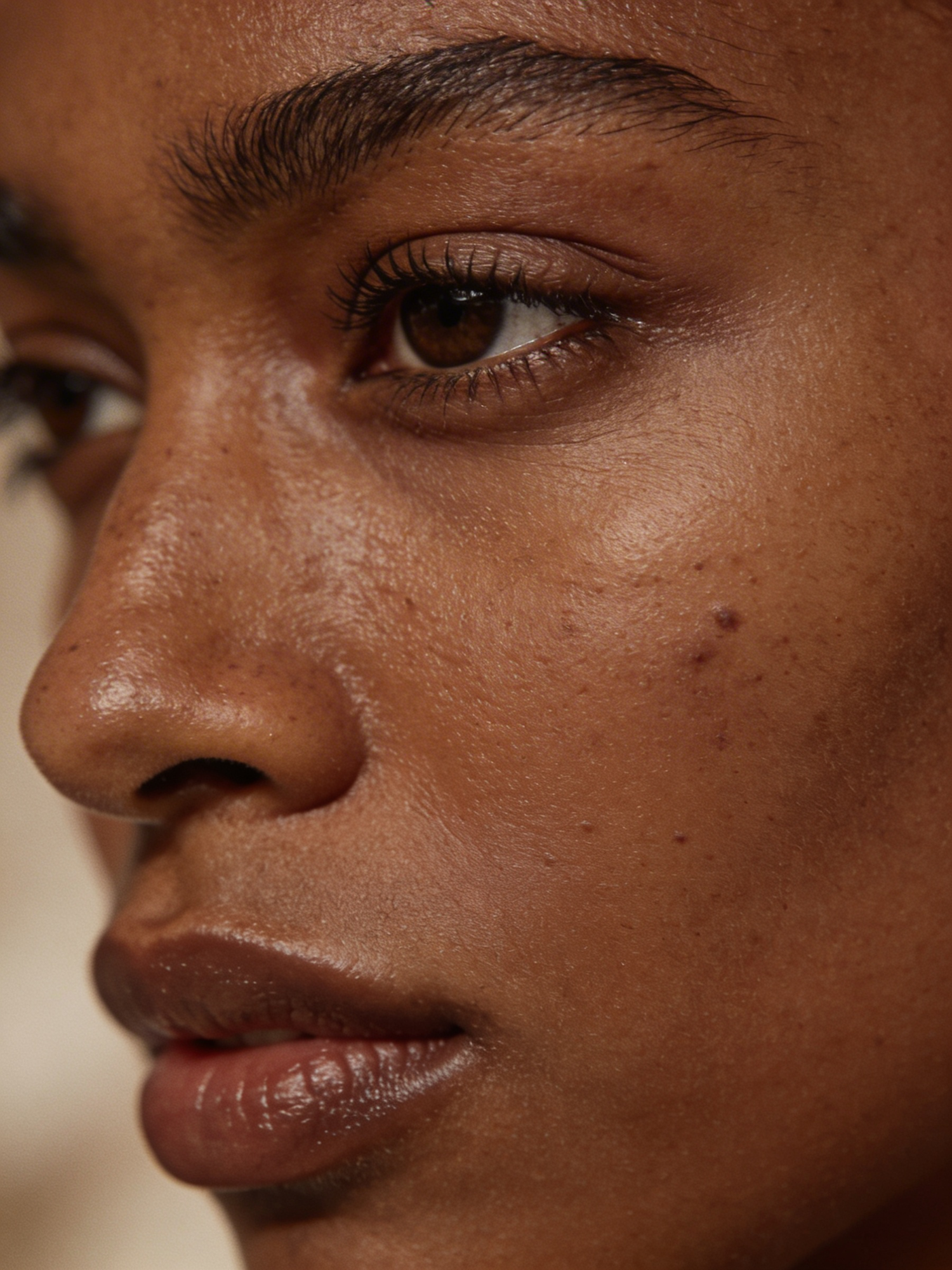 A deep‑toned matte skin finish with highly detailed natural texture, clean symmetry, no retouching, no artificial smoothing, and a true editorial realism.
