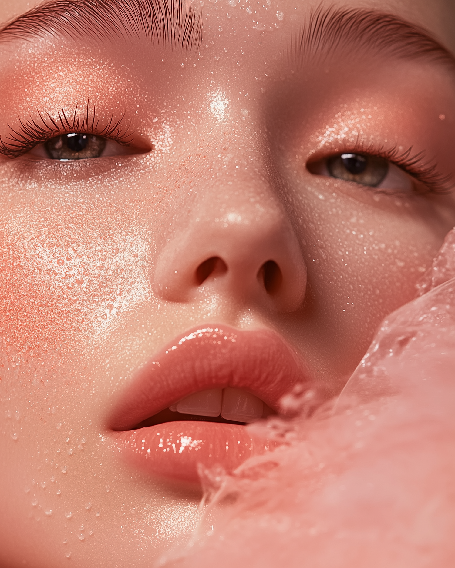 Close-up of a dewy face with glossy lips and shimmering eyeshadow, featuring a soft pink and peach color palette.