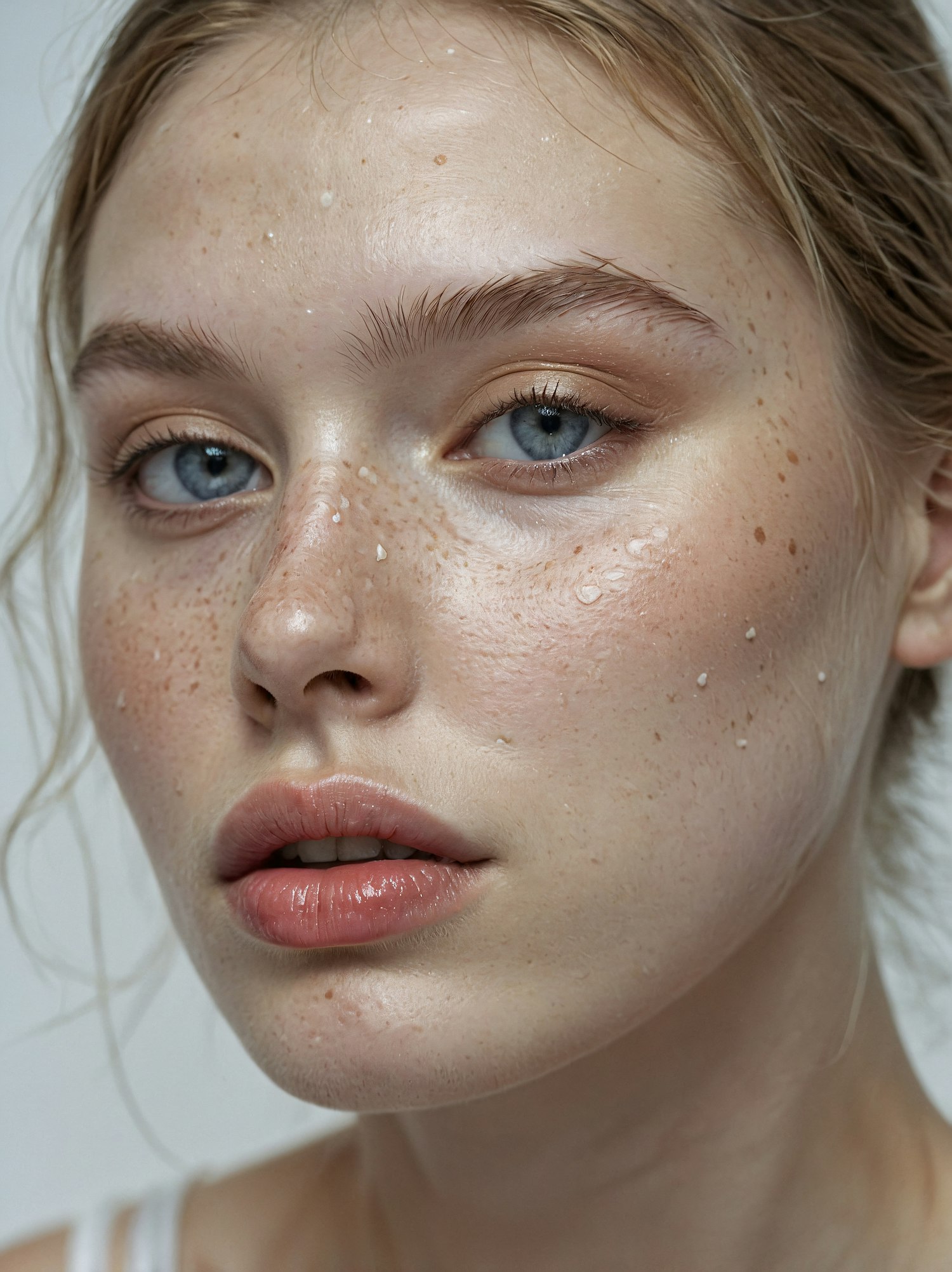 Close-up portrait of a young woman with blue eyes, freckles, and dewy skin, highlighting natural beauty and fresh appearance.