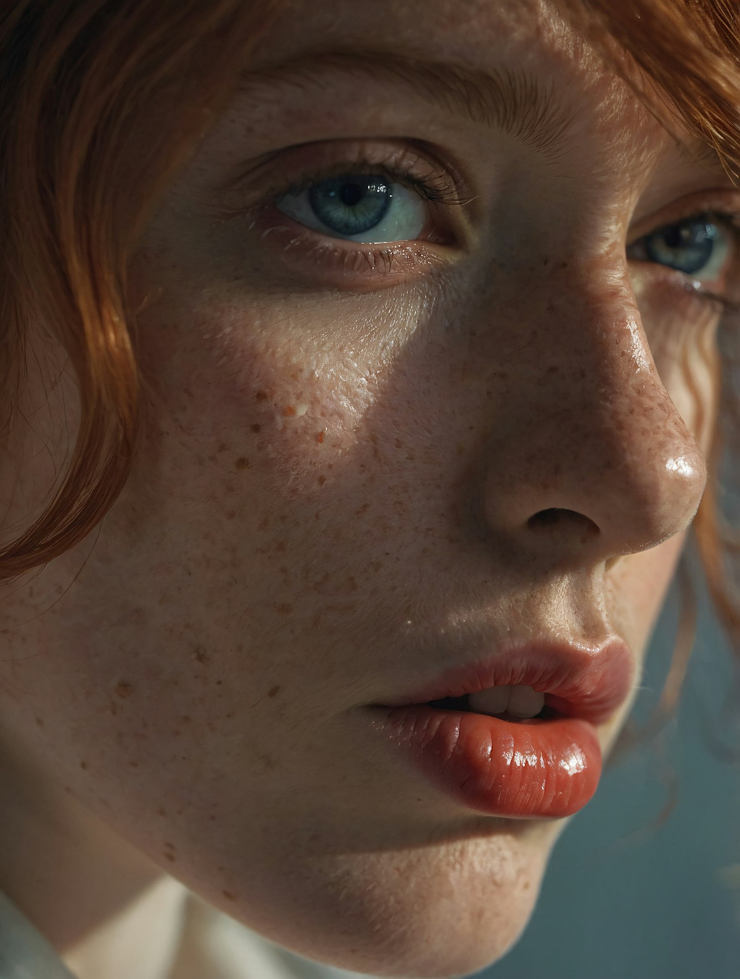 Close-up of a freckled face with blue eyes and red hair, highlighting natural beauty and texture.