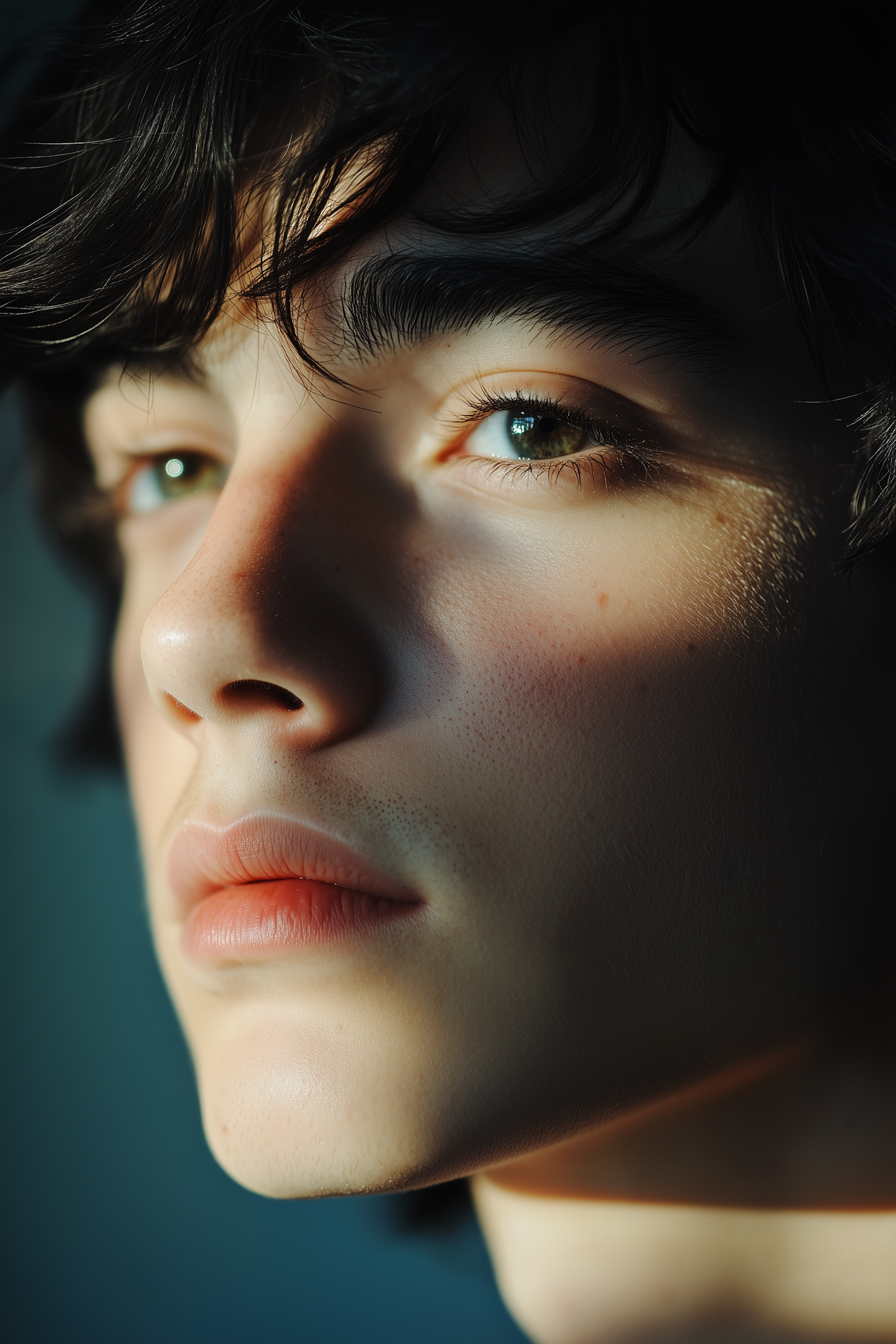 Close-up portrait of a young man with green eyes and dark hair, captured in soft lighting with a thoughtful expression.