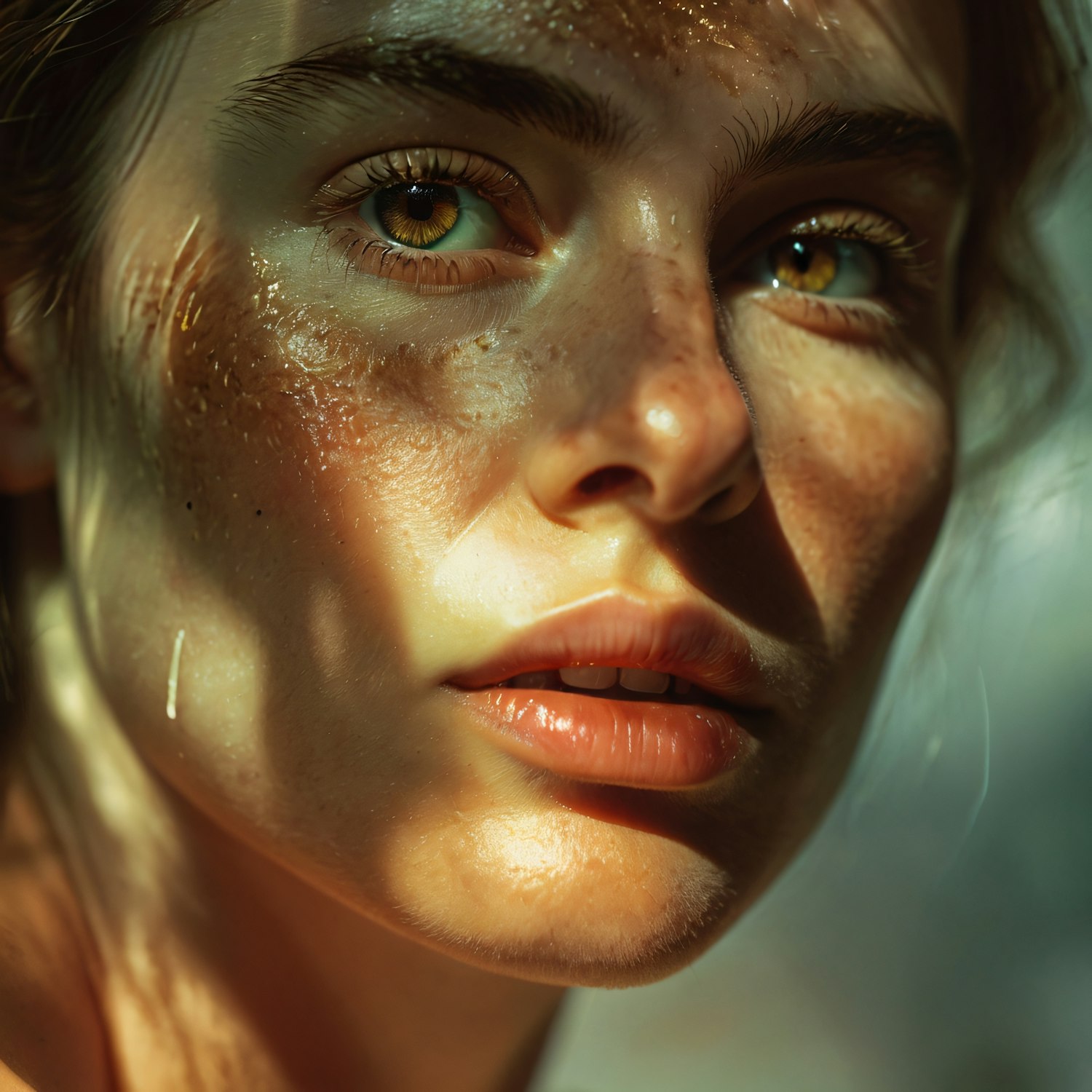 Close-up portrait of a woman with green eyes and freckles, bathed in warm sunlight and intricate shadows.