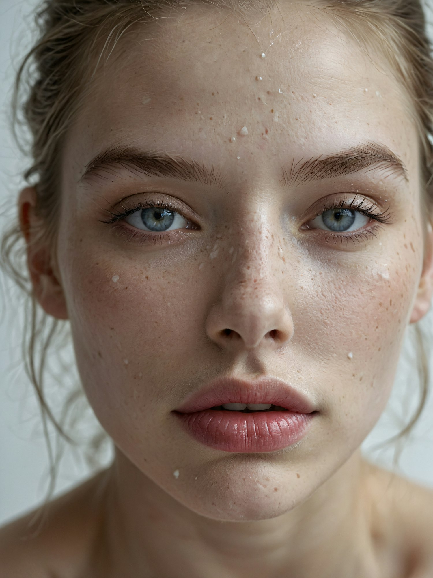 Close-up portrait of a young woman with dewy skin, light blue eyes, and freckles, showcasing natural beauty and serene expression.