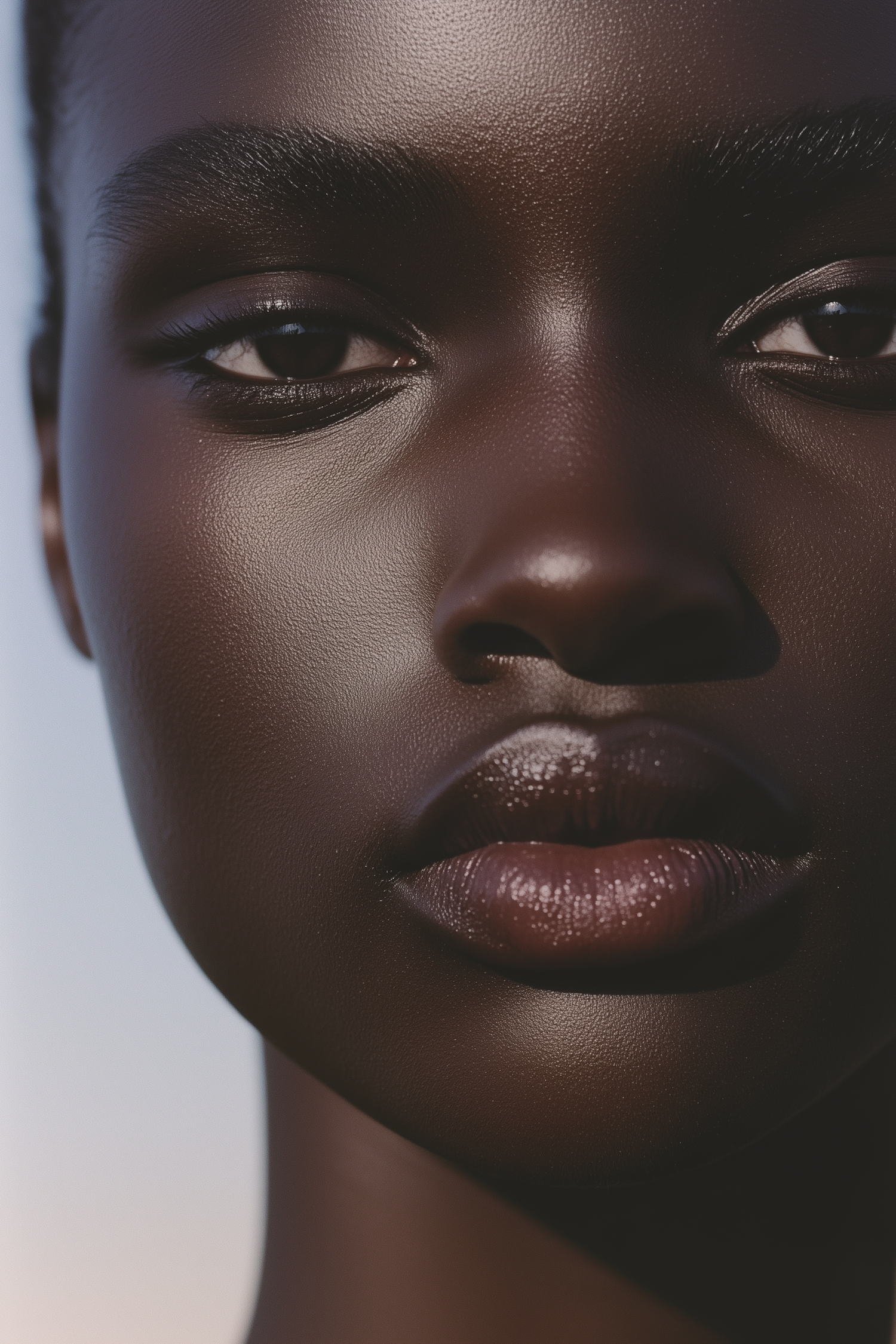 Close-up portrait of a person with dark skin, highlighting smooth texture, expressive eyes, and glossy lips against a blurred background.