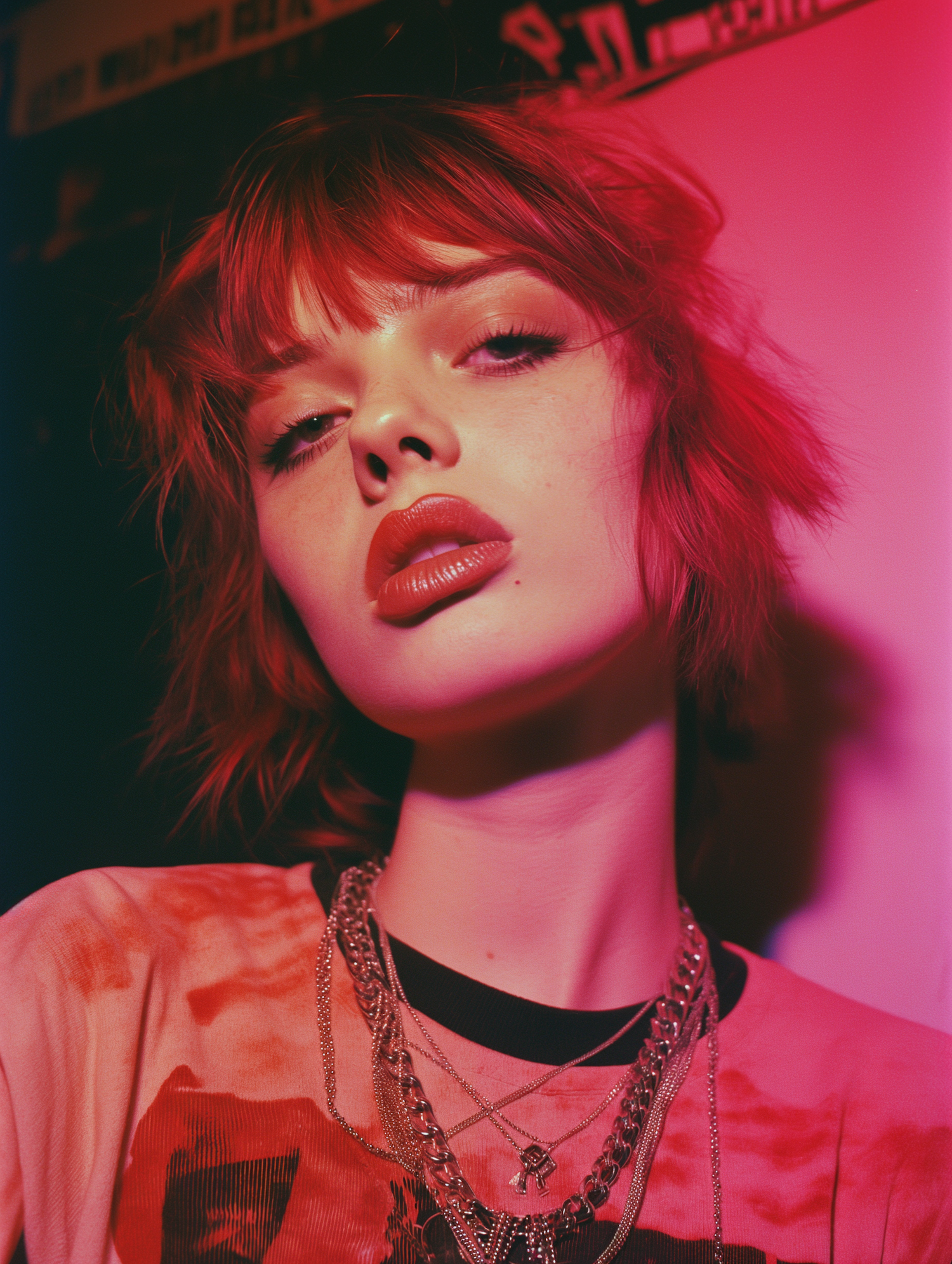 Confident young woman with red hair and bold makeup, wearing layered necklaces. Warm pink lighting enhances her striking look.