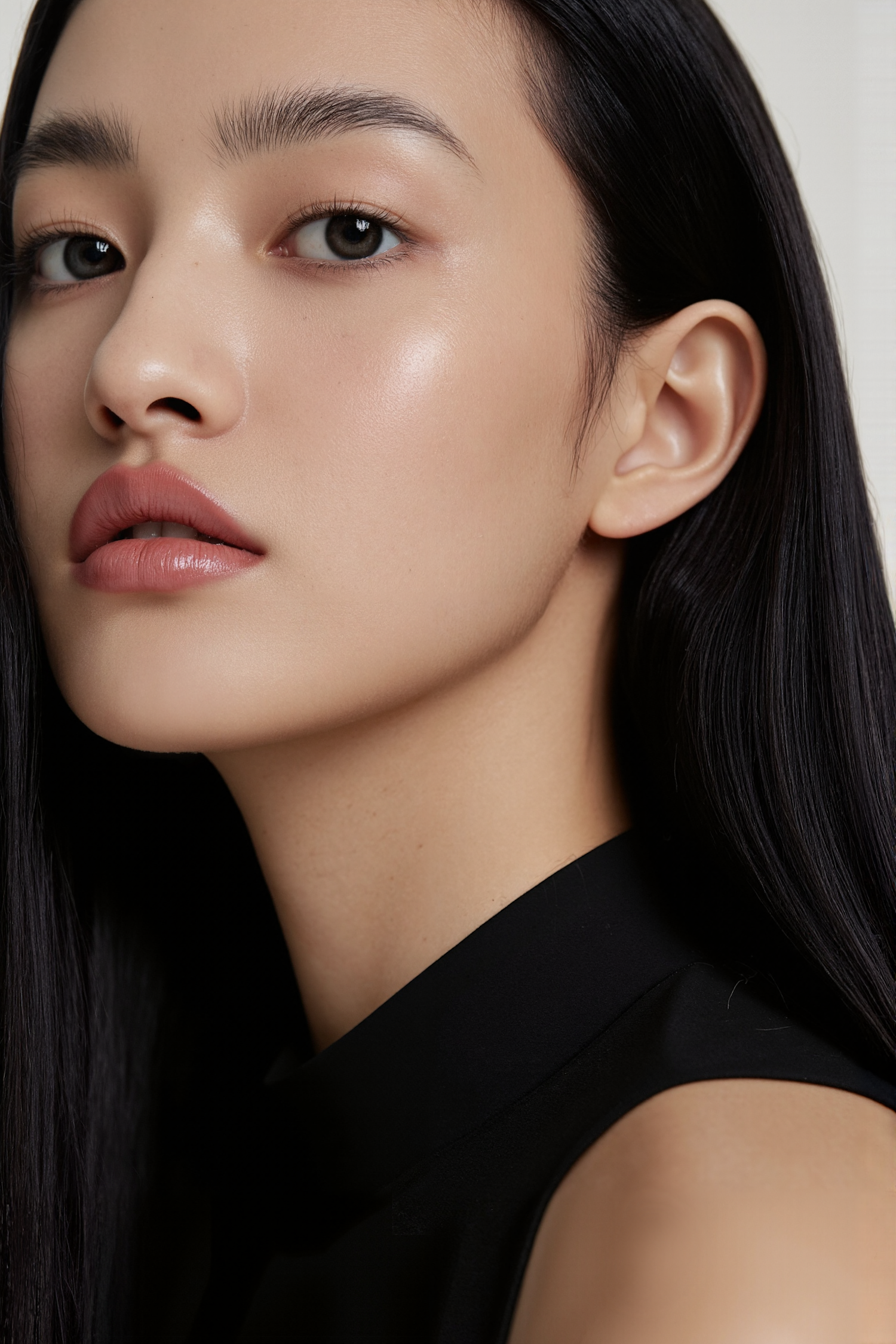 Close-up portrait of an Asian woman with flawless skin, dark eyes, and long black hair, wearing a black top against a neutral background.