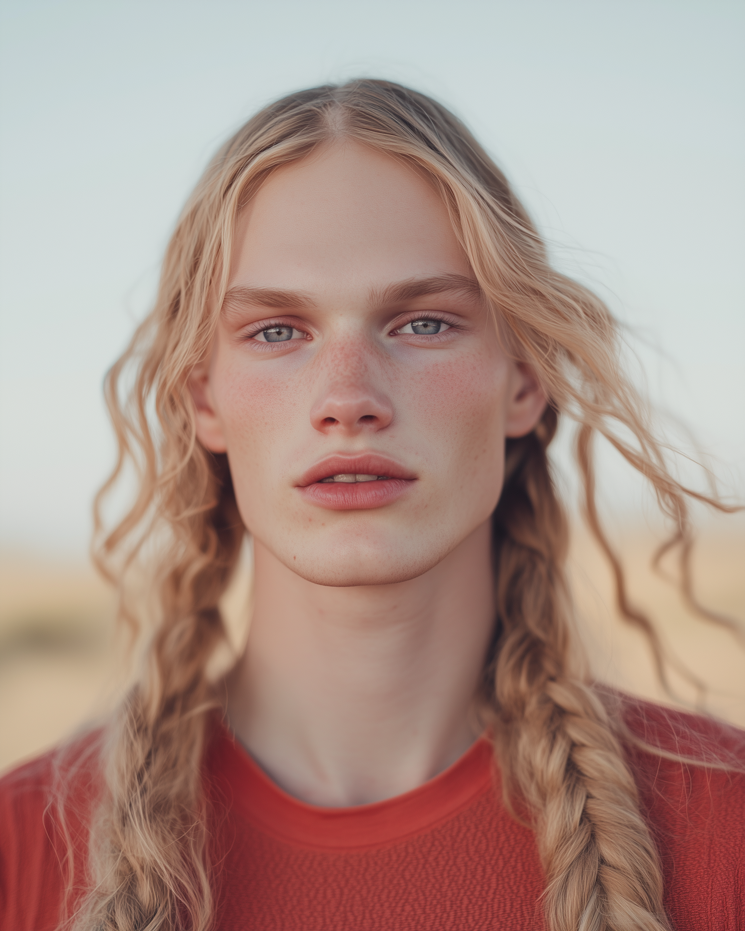 Portrait of a young person with long blonde braids, light blue eyes, and a red shirt, set against a blurred outdoor background.