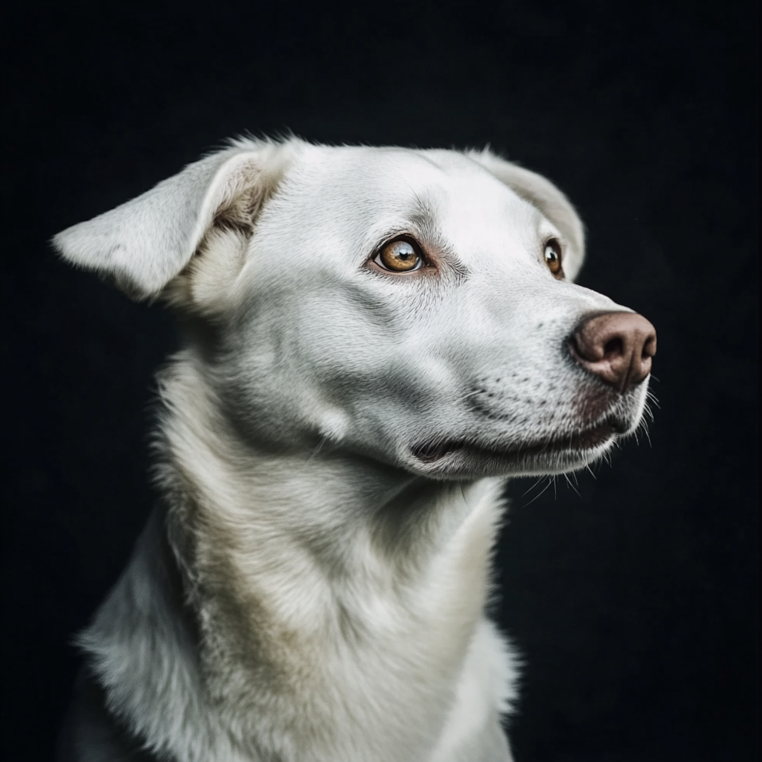 Close-up portrait of a white dog with brown eyes against a black background, highlighting its attentive gaze and soft fur.
