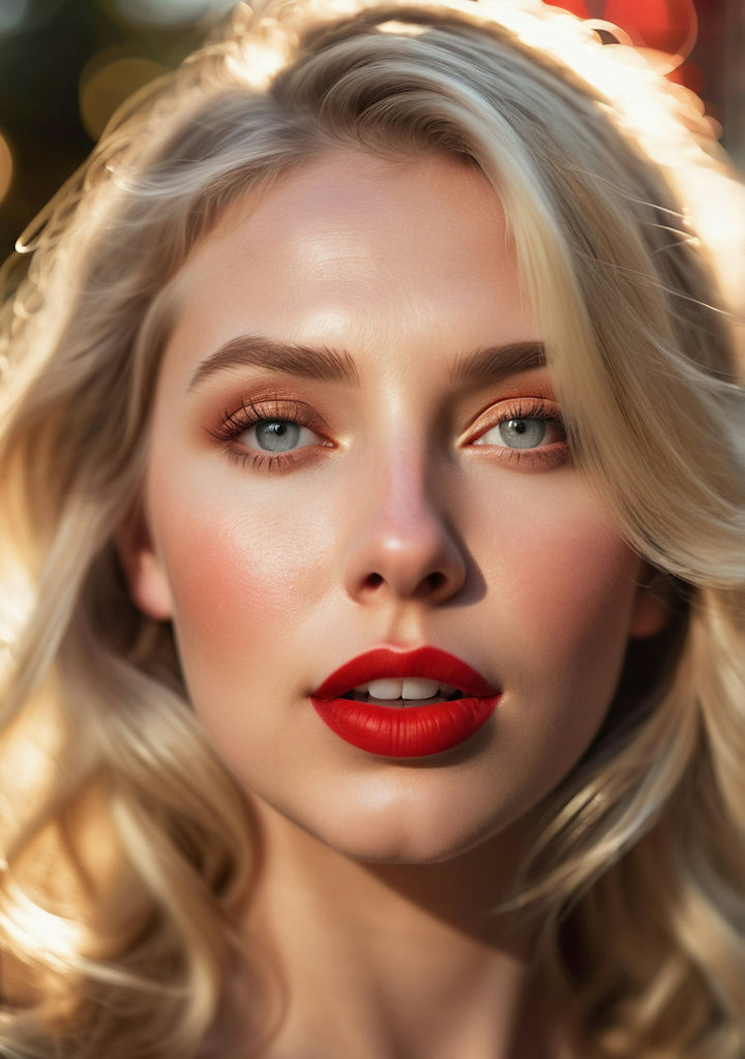 Close-up of a blonde woman with blue eyes and red lipstick, bathed in warm sunlight, creating a serene and confident expression.