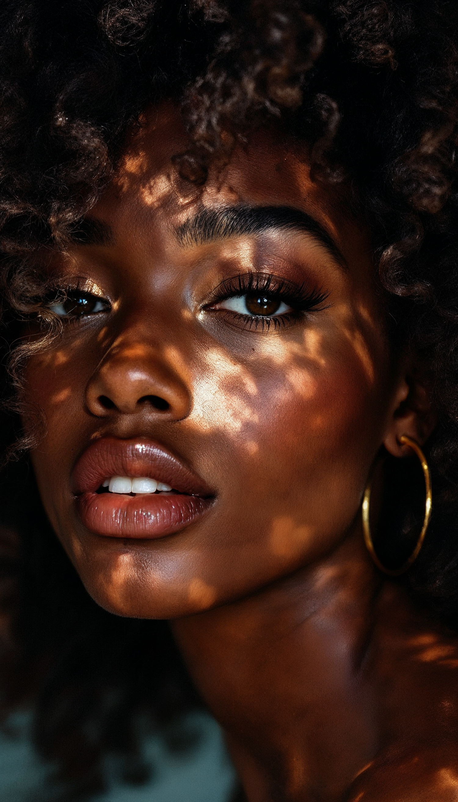 Close-up portrait of a Black woman with curly hair, gold hoop earrings, and dappled lighting on her face, highlighting her features.