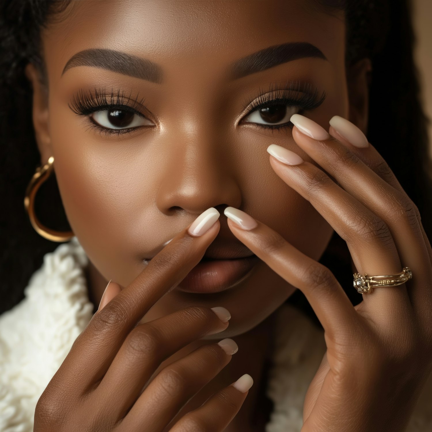 Close-up of a Black woman with radiant skin, gold accessories, and nude manicured nails, highlighting her natural beauty and elegance.