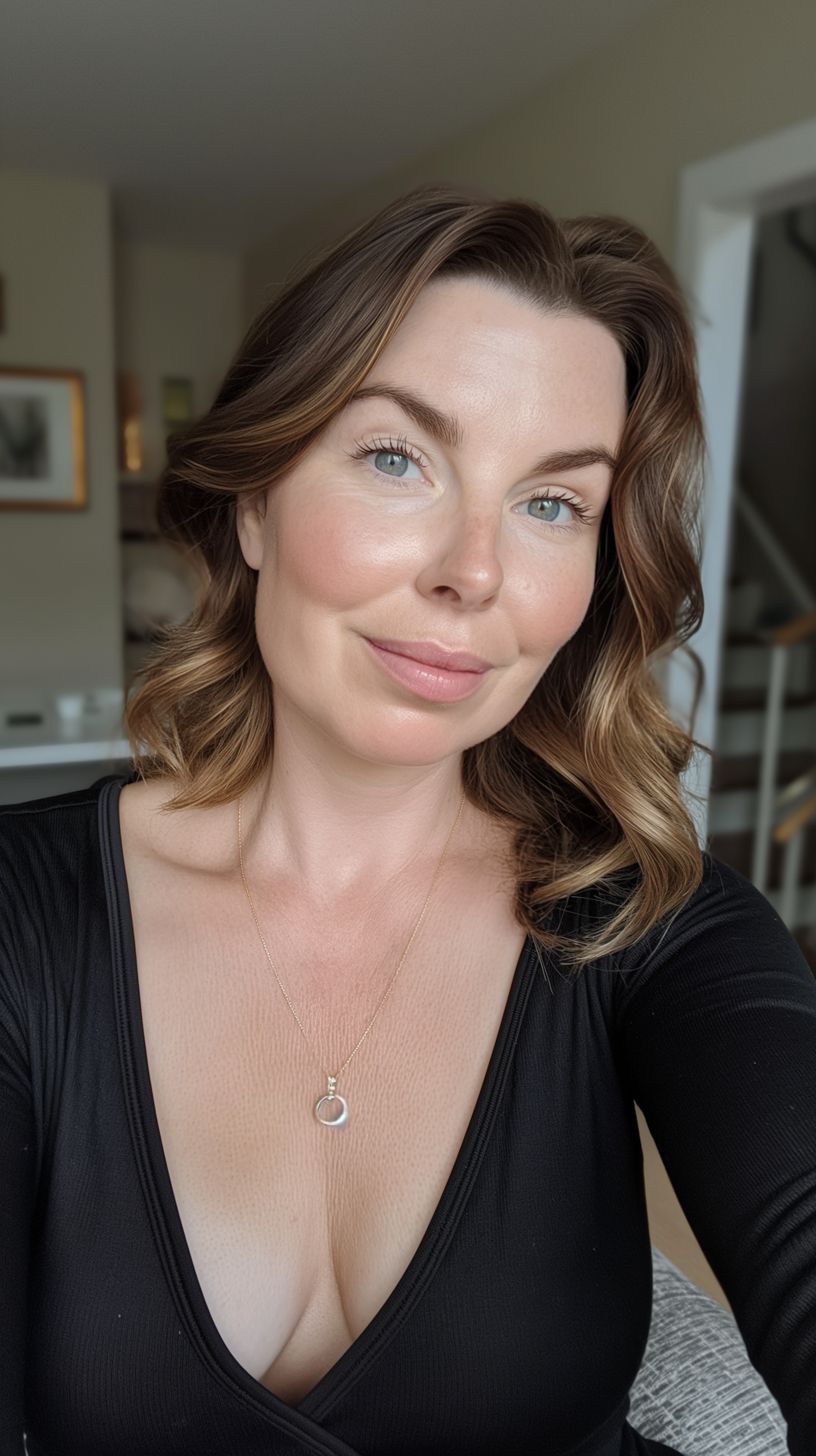Caucasian woman with light brown hair and blue eyes, wearing a black V-neck top and gold necklace, taking a selfie indoors.