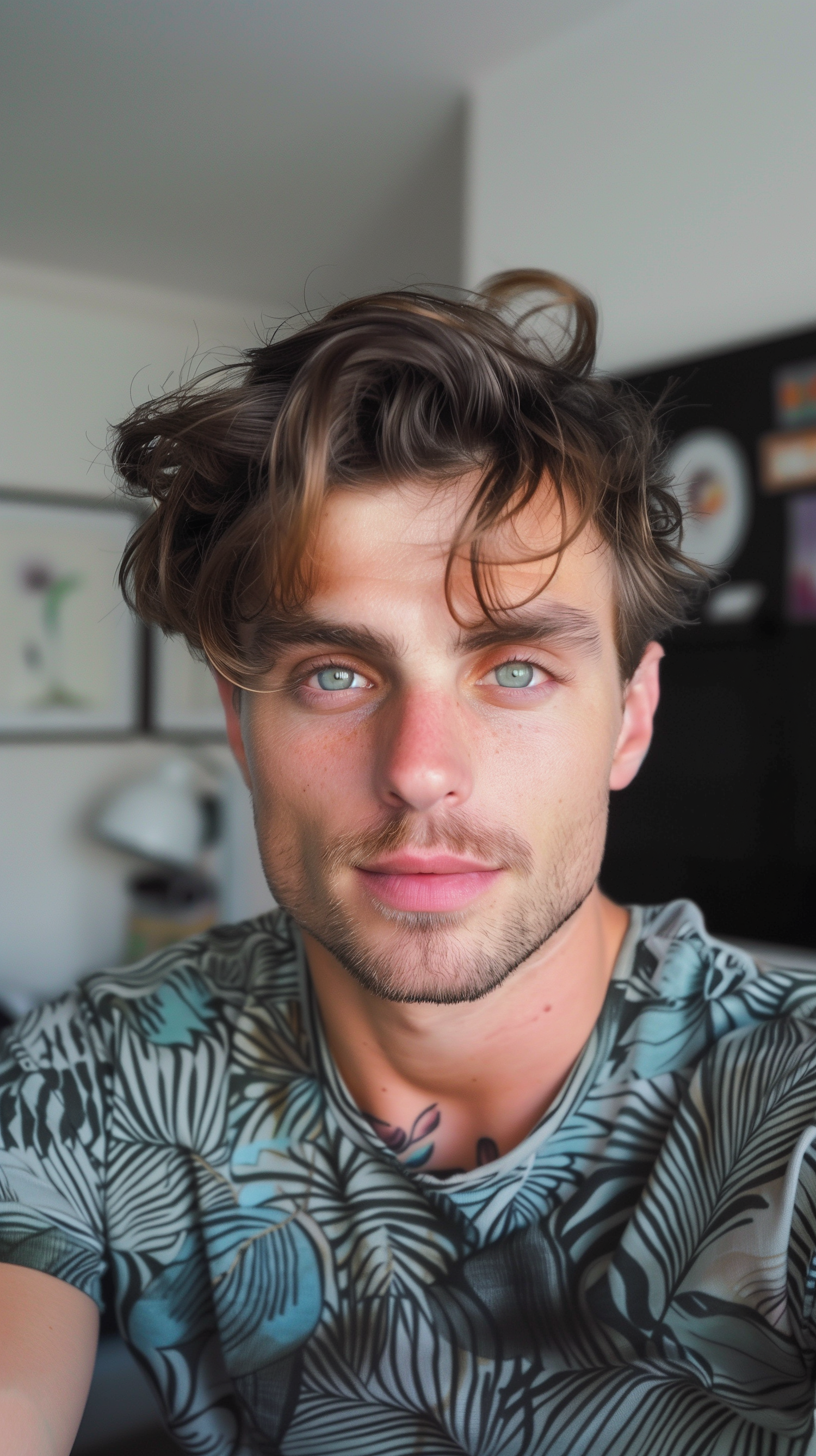 Young man with tousled brown hair and blue eyes, wearing a leaf-patterned shirt. Calm expression, indoor setting with blurred background.