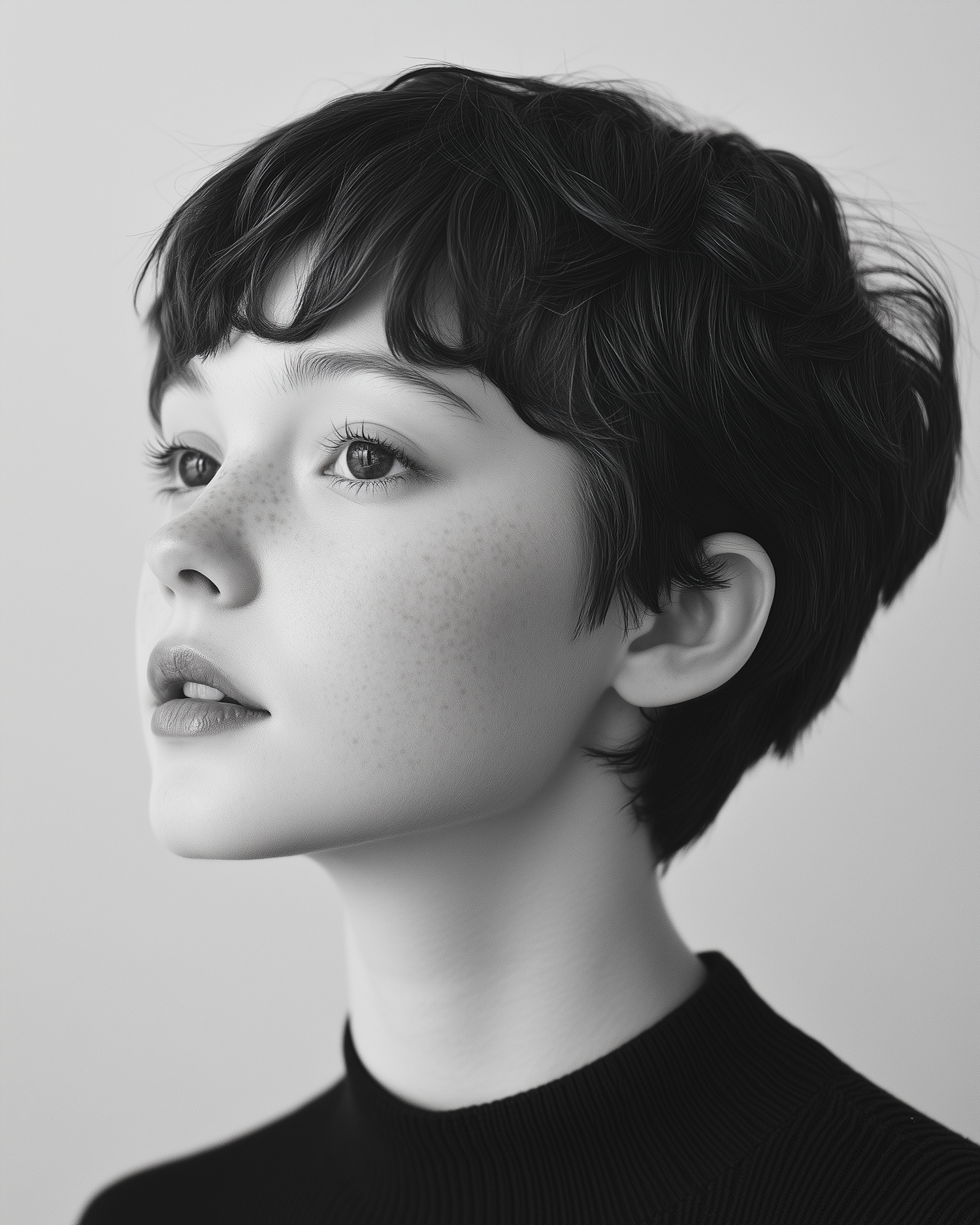 Portrait of a young woman with short dark hair, freckles, and a contemplative expression against a neutral background.