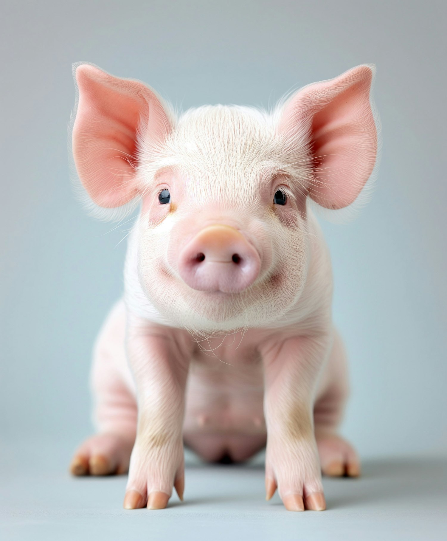 Adorable piglet with pink skin and floppy ears, standing on a soft gray background. Bright eyes and a curious expression.