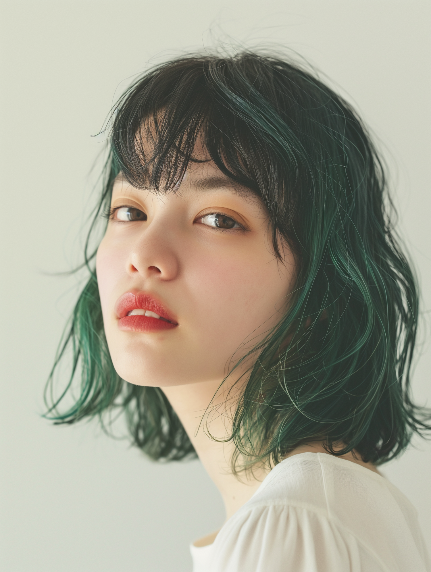 Portrait of a young woman with dark green hair and soft red lips, exuding a serene expression against a light background.