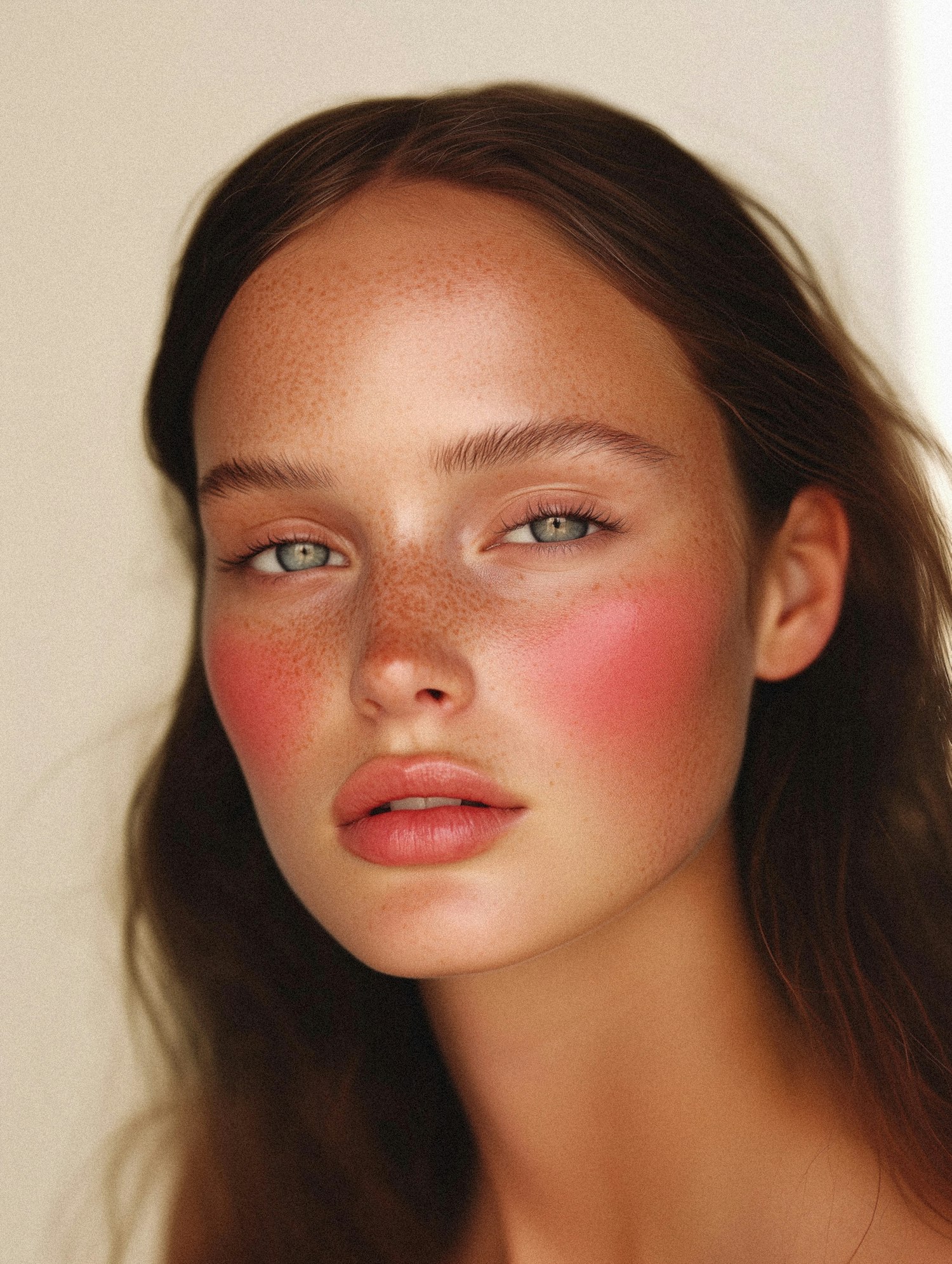 Portrait of a young woman with freckles, light blue eyes, and rosy cheeks, exuding natural beauty and elegance.