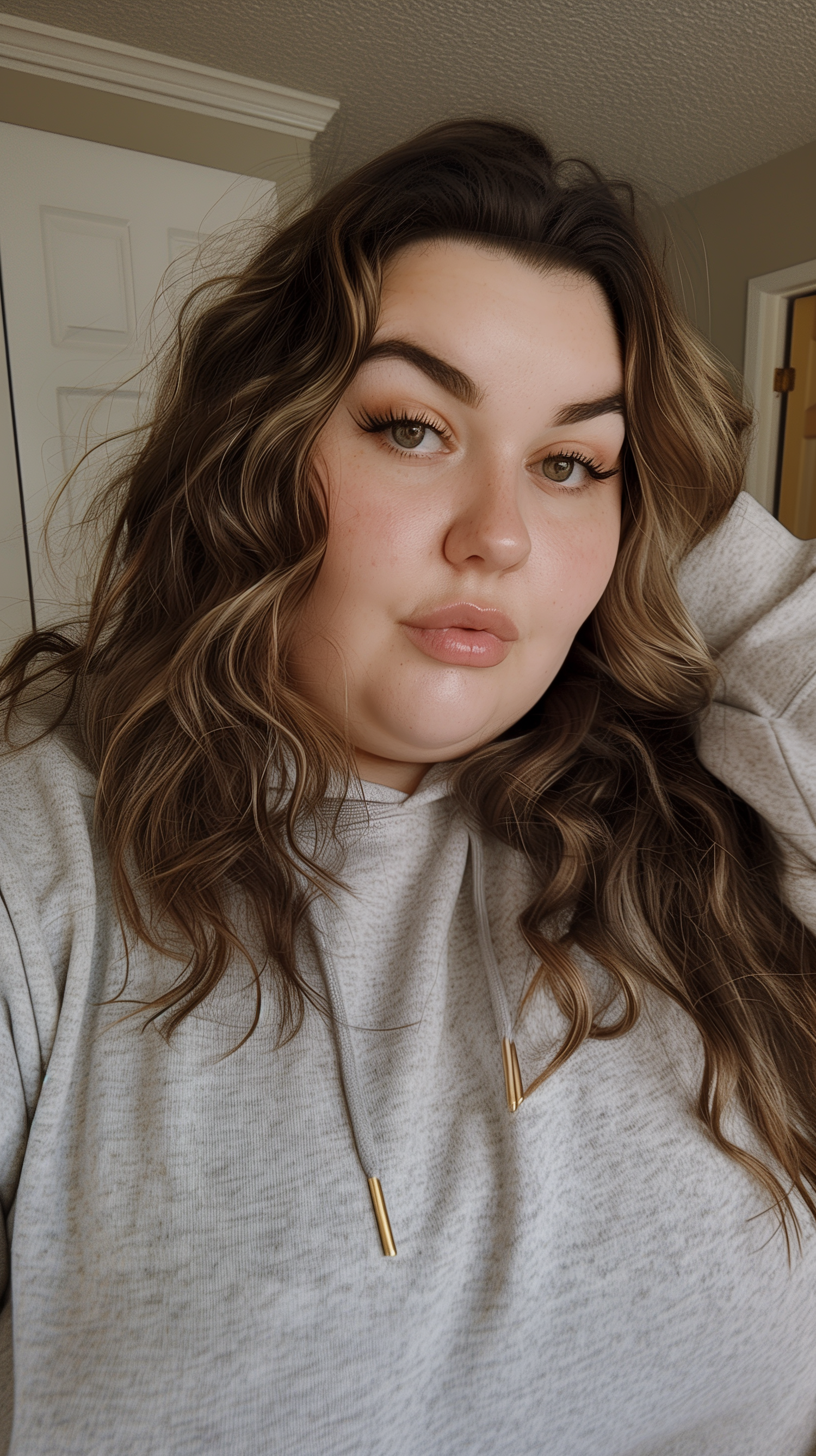 Young woman with wavy brown hair and fair skin in a gray hoodie, posing indoors with a calm expression.