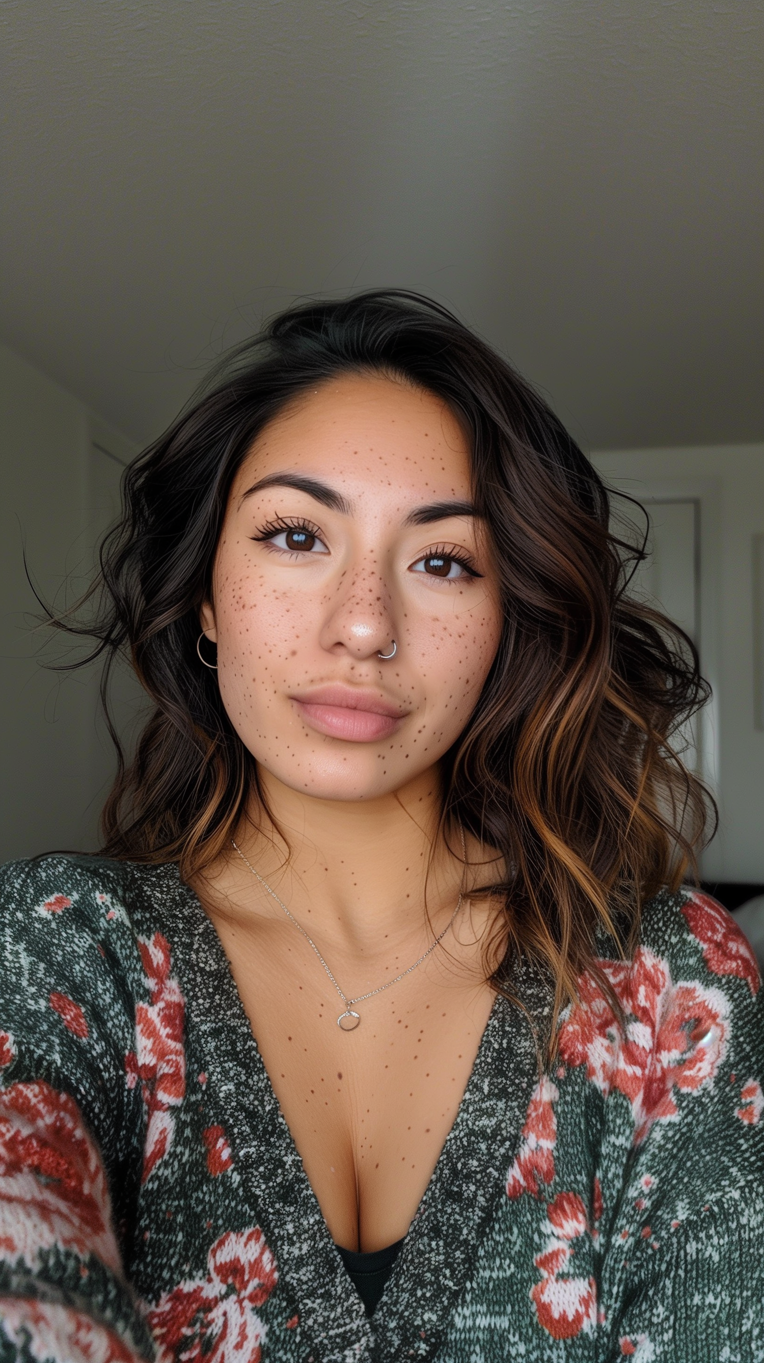 Young woman with freckles and wavy hair in a floral sweater, posing for a selfie with a neutral expression.