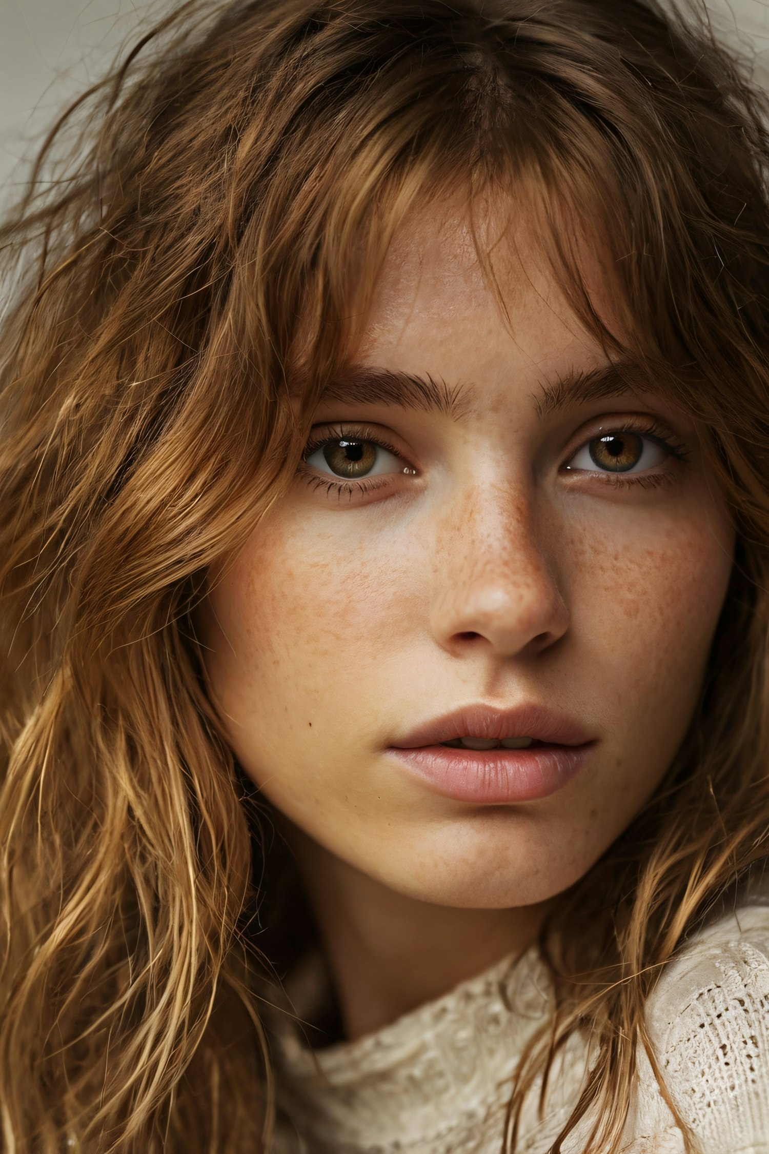 Close-up portrait of a young woman with freckles, light brown hair, and hazel eyes, wearing a cream textured top.