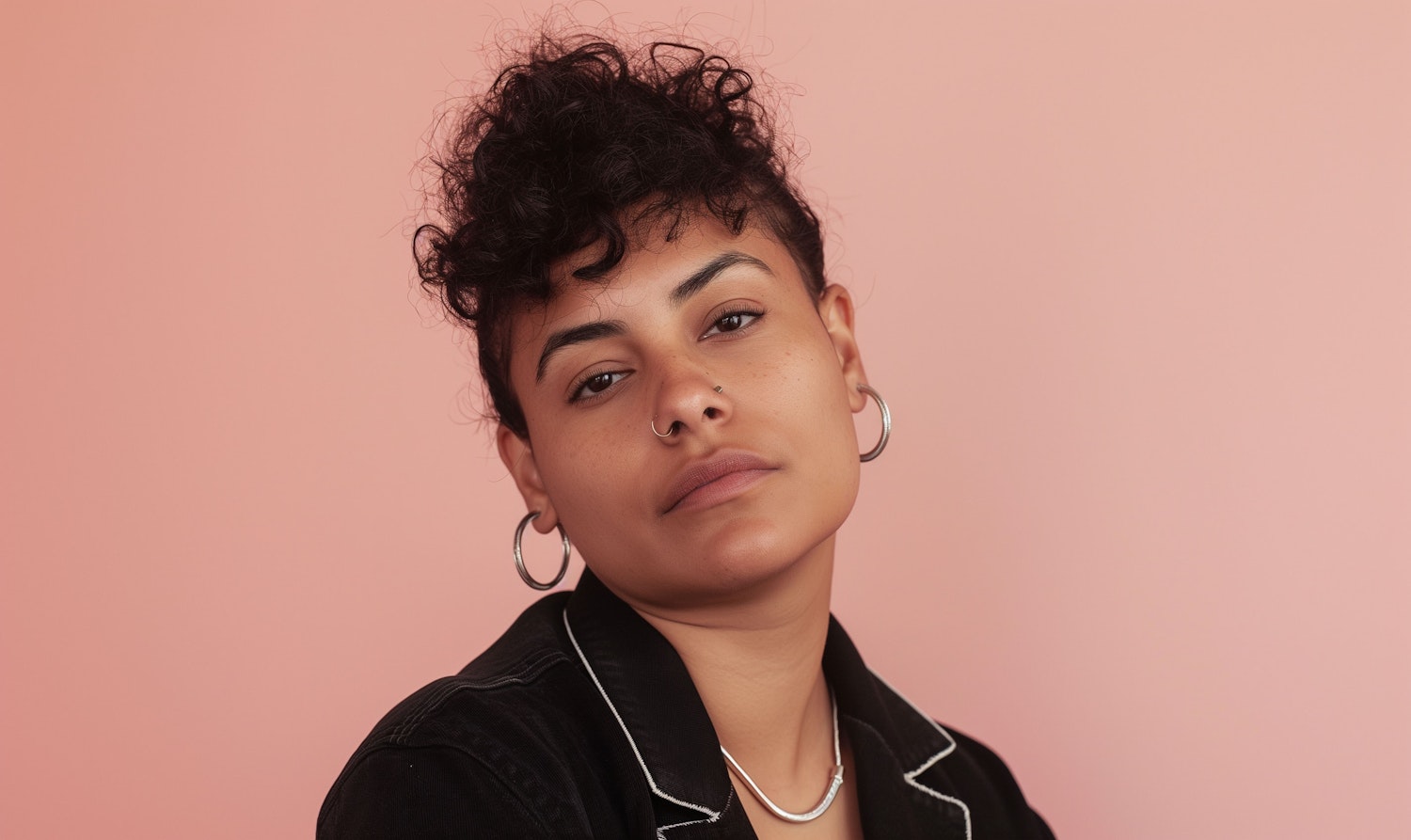 Person with curly hair and hoop earrings against a pink background, wearing a black jacket and silver jewelry.