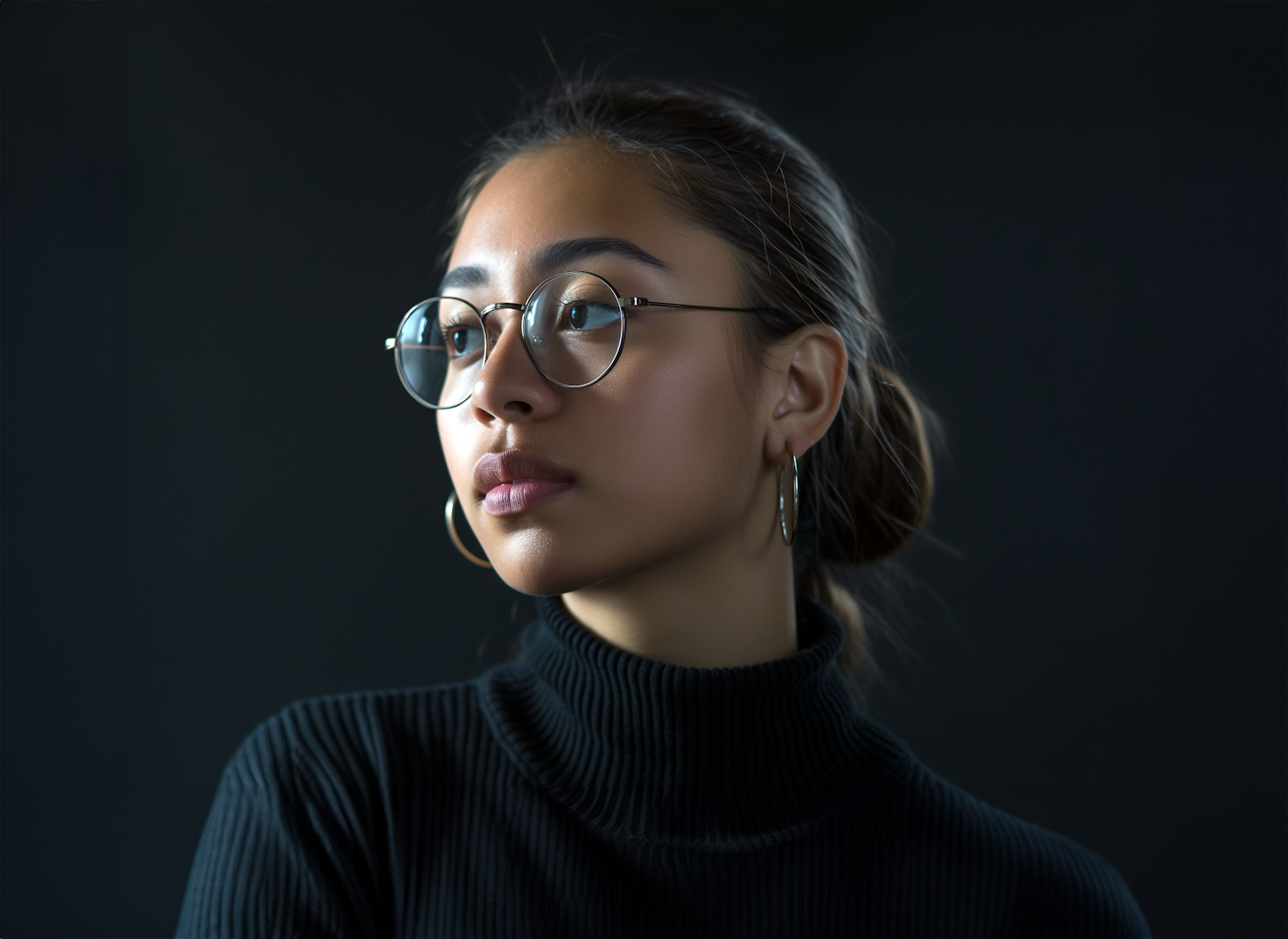 Young woman with glasses and hoop earrings in a black turtleneck, gazing thoughtfully. Dark background enhances her serene expression.