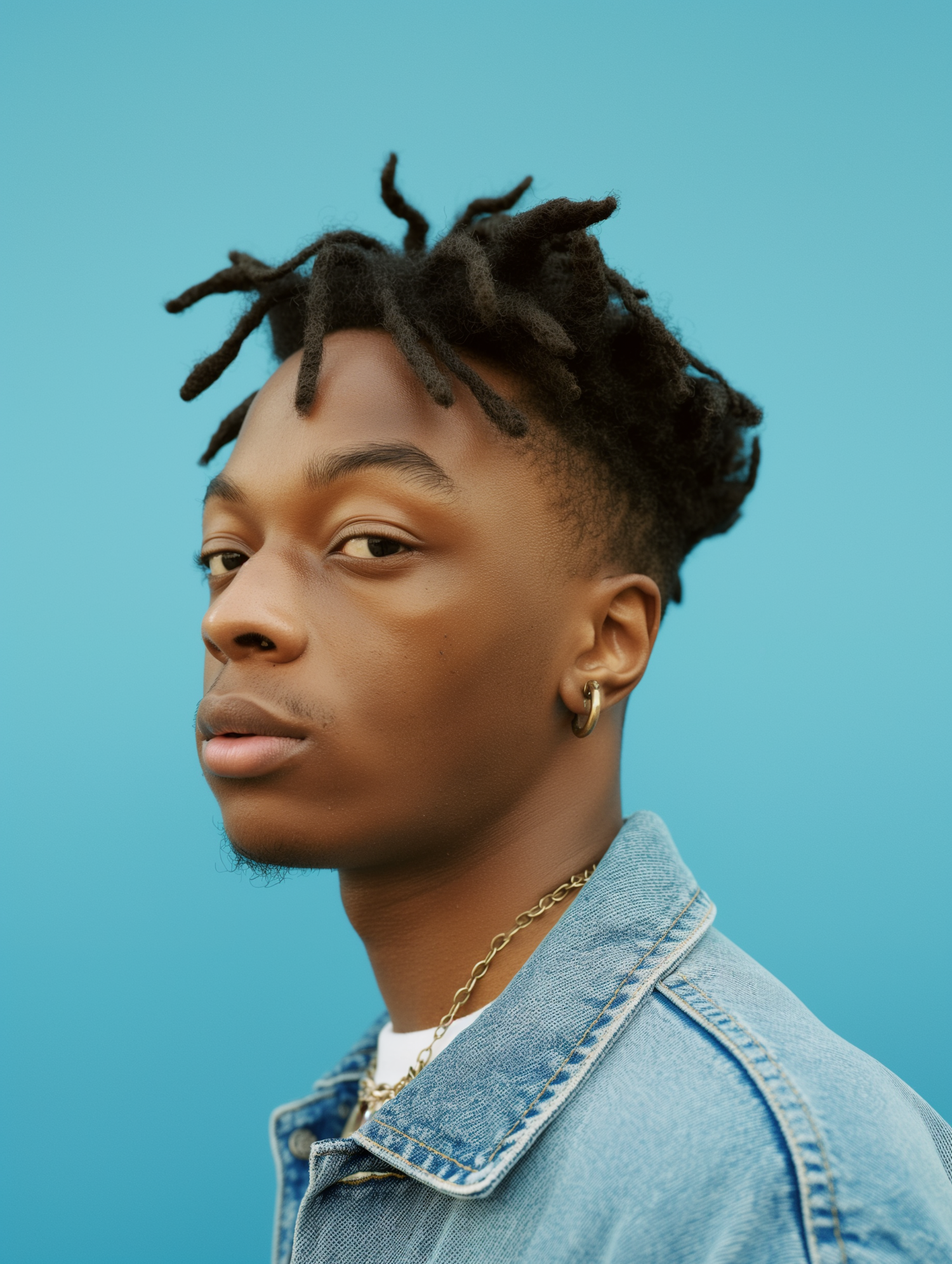 Stylish young man with dreadlocks and denim jacket against a vibrant blue background, exuding confidence and modern fashion.