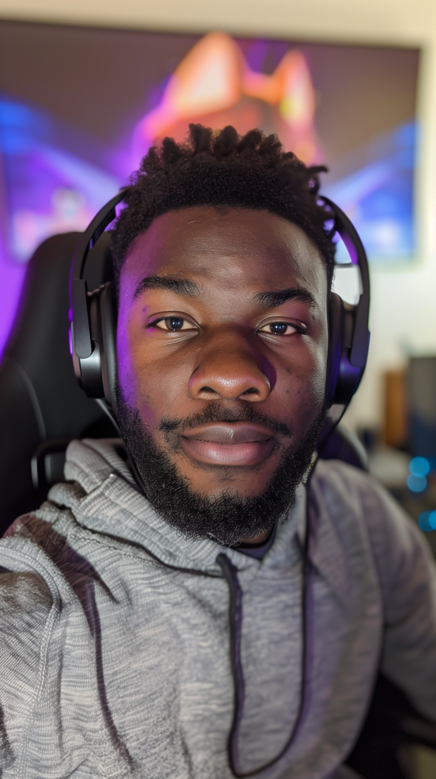 Young man with headphones and a gray hoodie, sitting in front of a colorful blurred screen, looking directly at the camera.