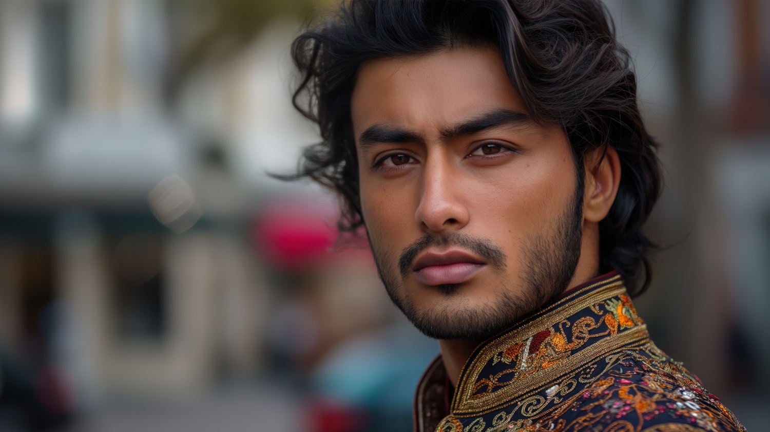 Portrait of a young man in a richly embroidered traditional outfit, gazing intensely with expressive dark eyes and wavy black hair.