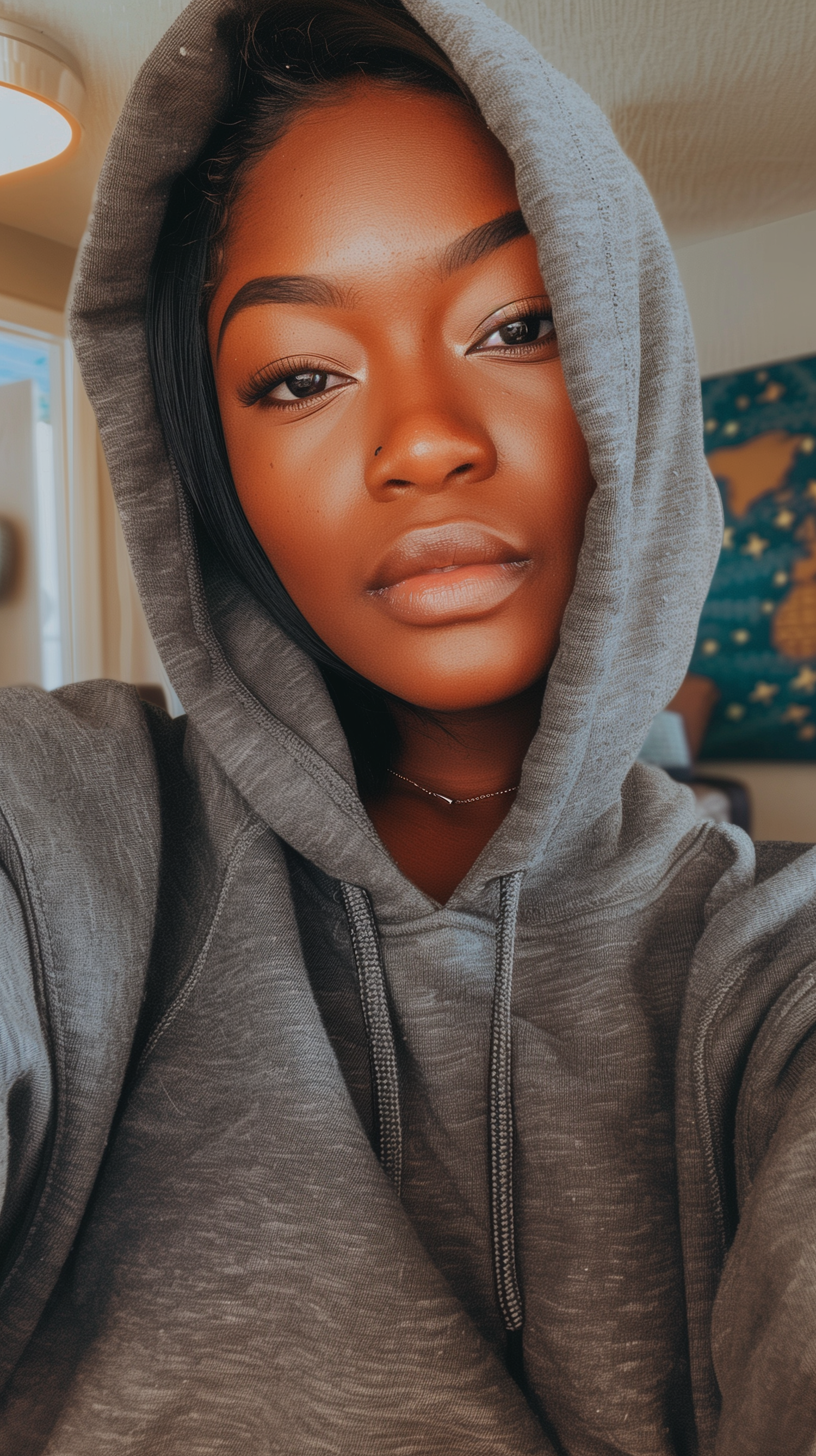 Portrait of a young woman in a gray hoodie, with warm lighting highlighting her expressive eyes and smooth skin.