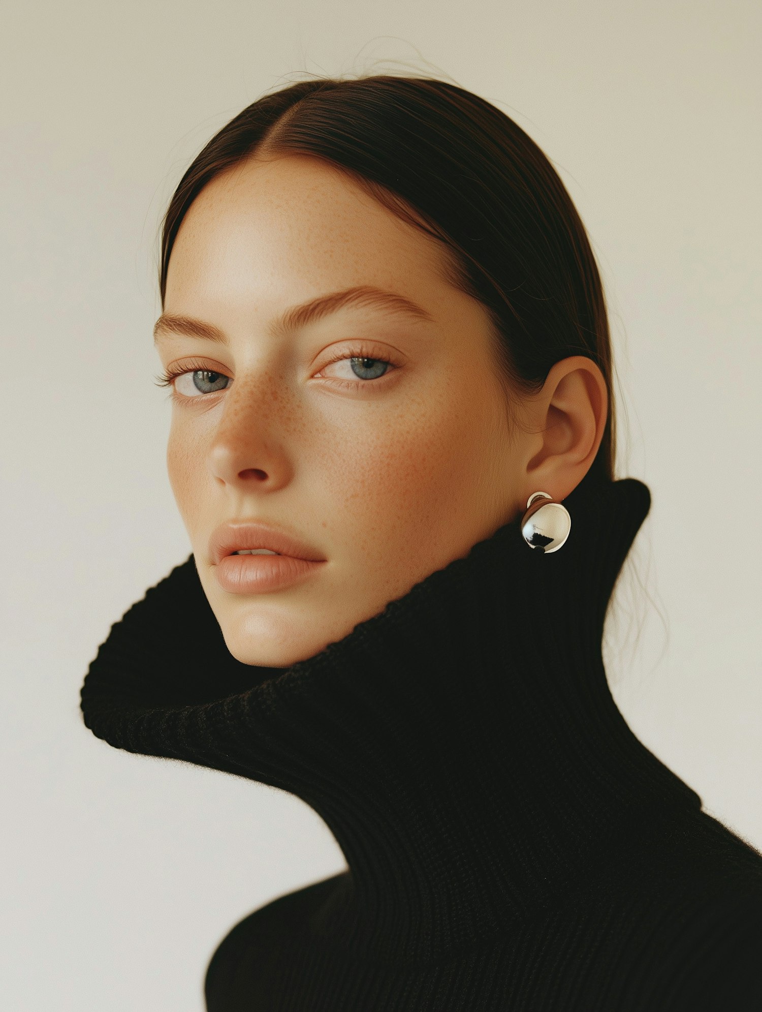 Elegant portrait of a young woman in a black turtleneck, featuring light blue eyes and a silver earring against a neutral background.
