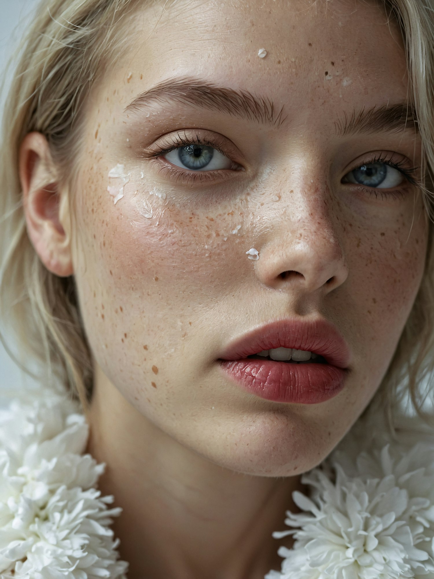 Close-up of a young woman with blue eyes, freckles, and blonde hair, wearing white floral attire. Skincare product visible on her face.