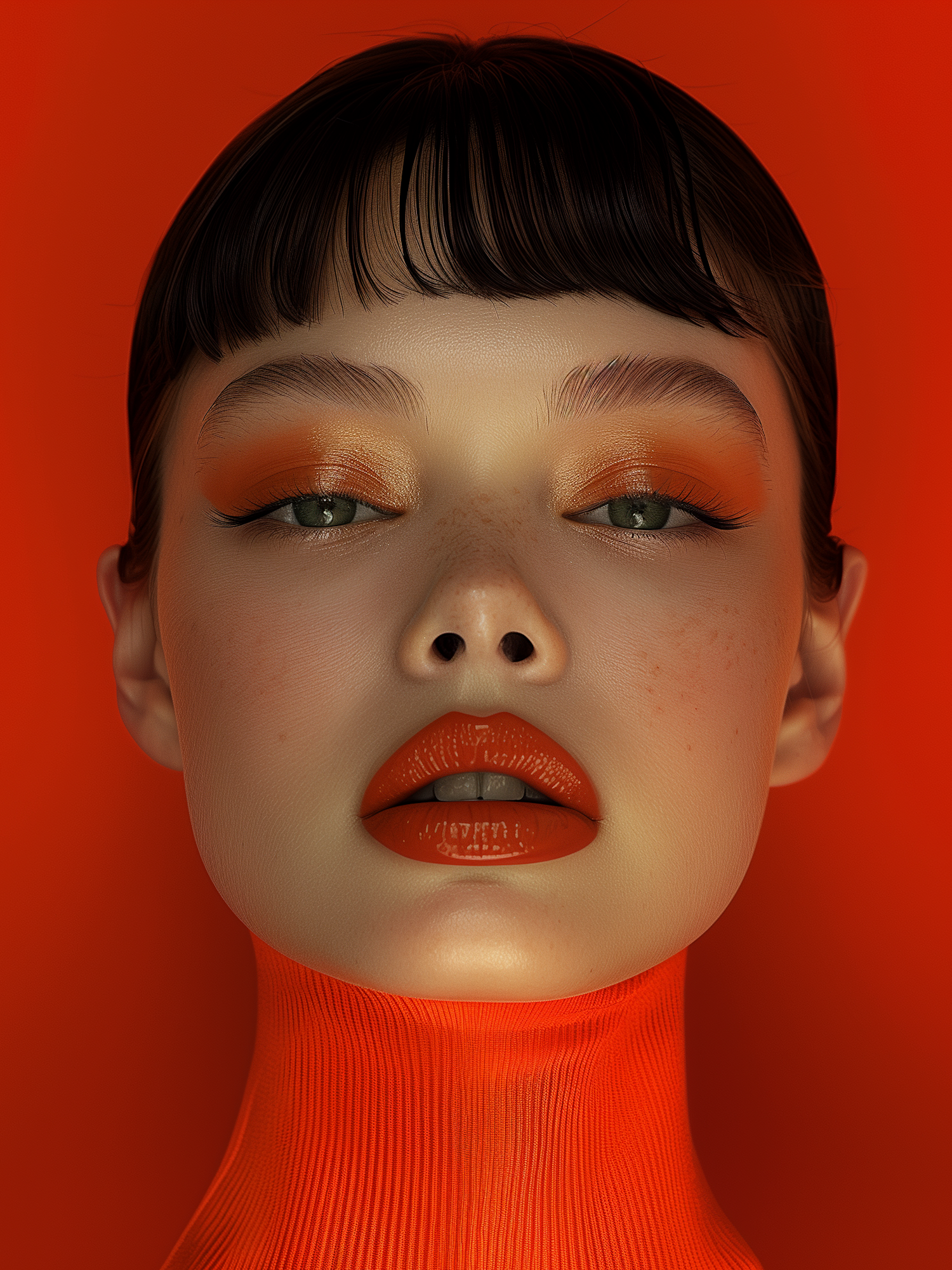 Close-up portrait of a woman with bold orange makeup and matching background, creating a striking visual effect.