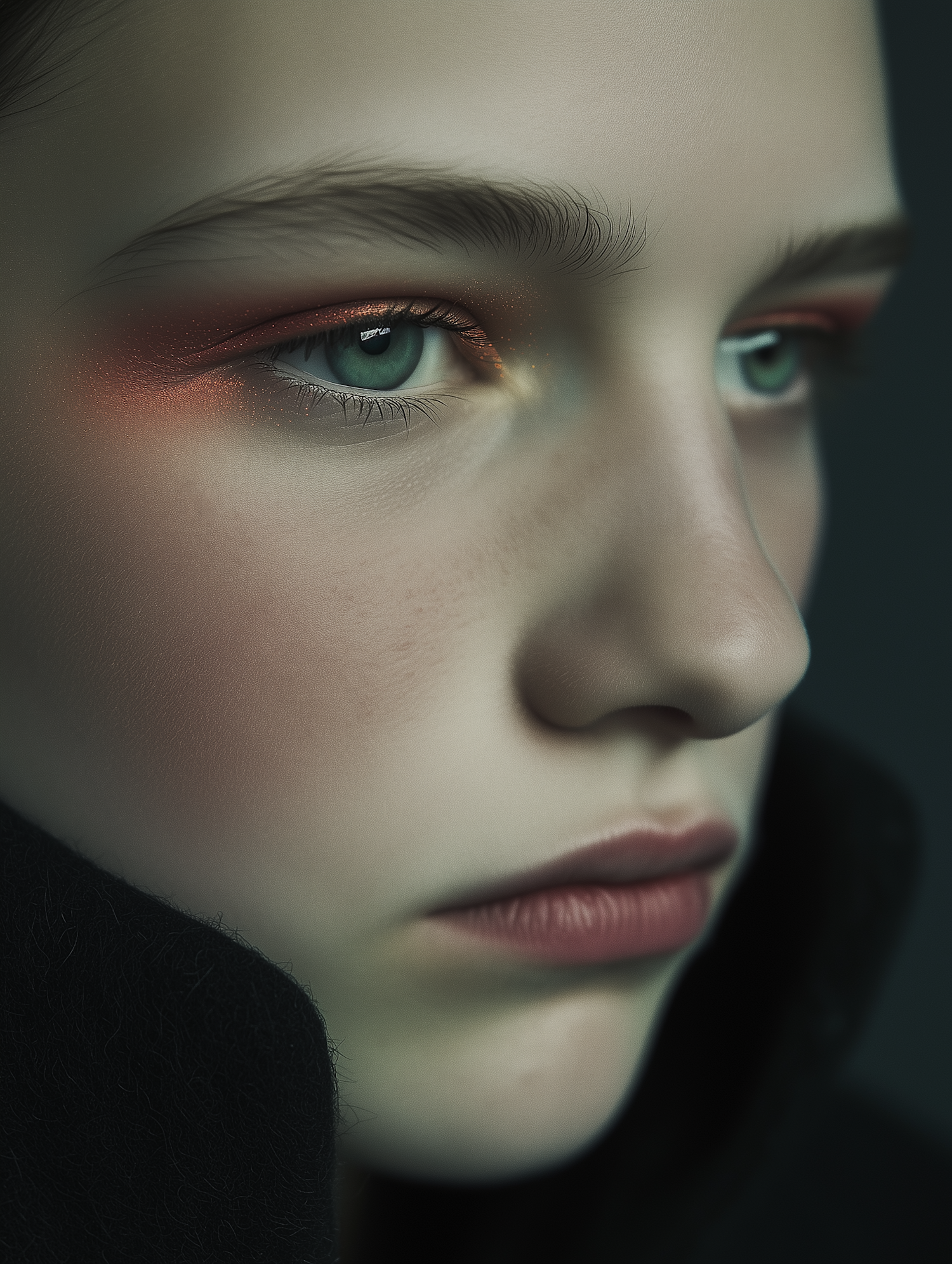 Close-up portrait of a young person with light blue eyes and copper eyeshadow, creating a serene and contemplative mood.