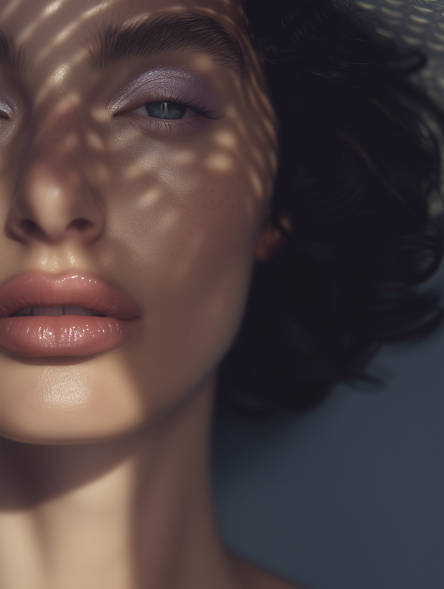 Close-up of a woman with glossy lips, lavender eyeshadow, and intricate shadow patterns on her face, creating an artistic effect.