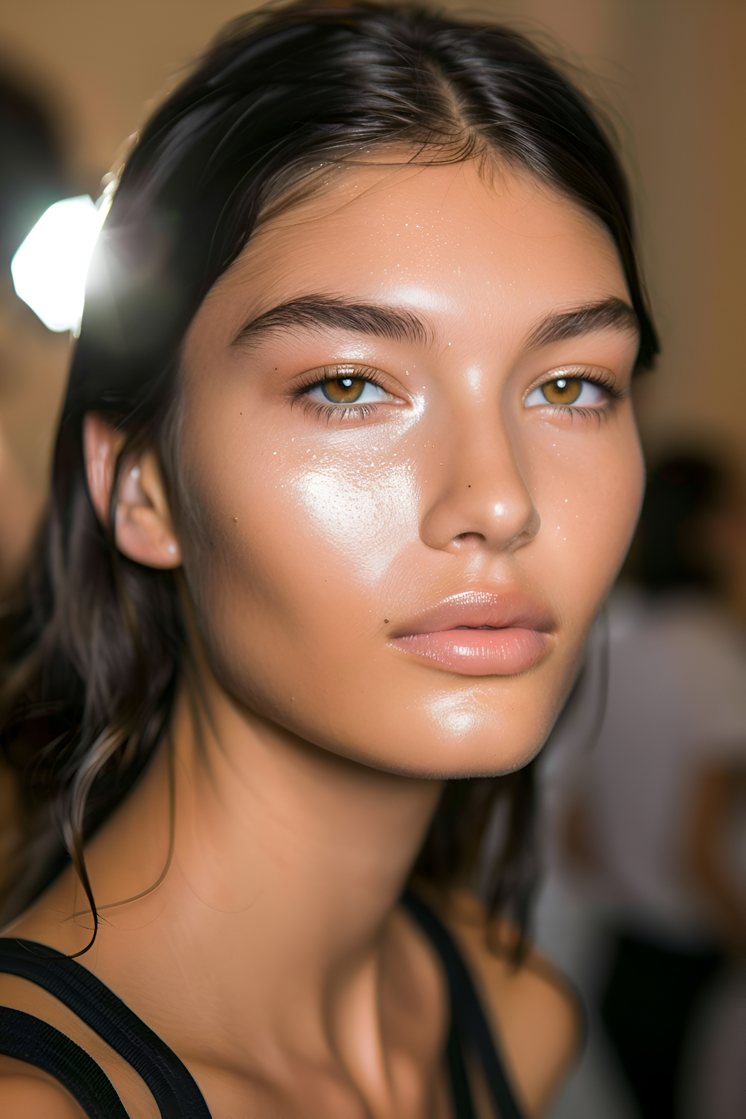 Close-up portrait of a young woman with glowing skin, hazel eyes, and dark hair, highlighting her natural beauty and glossy lips.