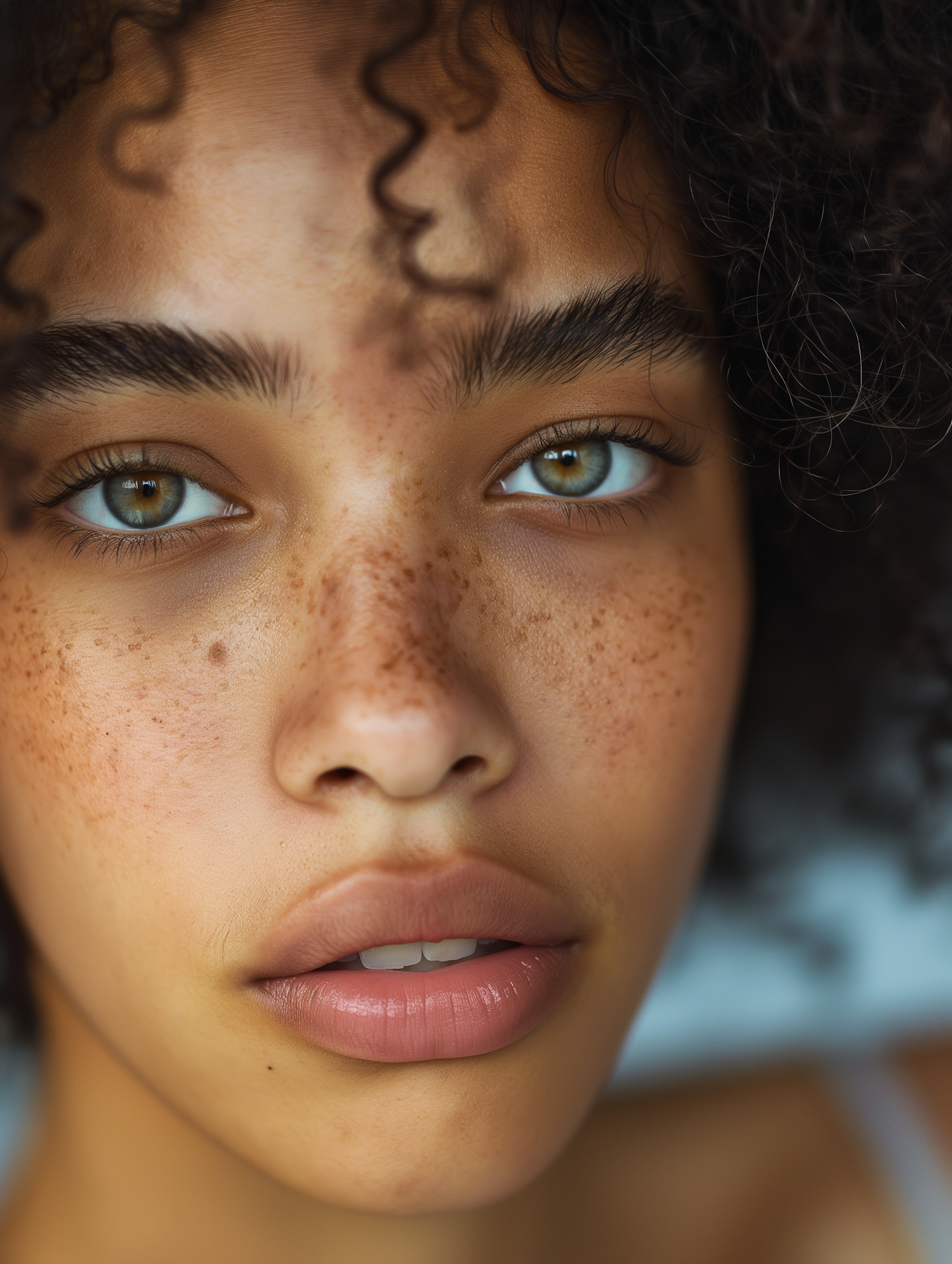 Close-up portrait of a young woman with green eyes, freckles, and curly hair, showcasing natural beauty and striking features.