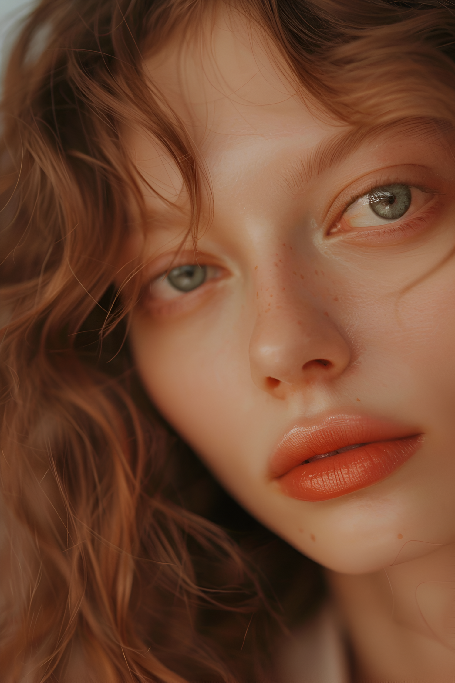 Close-up of a young woman with green eyes, freckles, and coral lips, framed by wavy light brown hair in soft natural lighting.