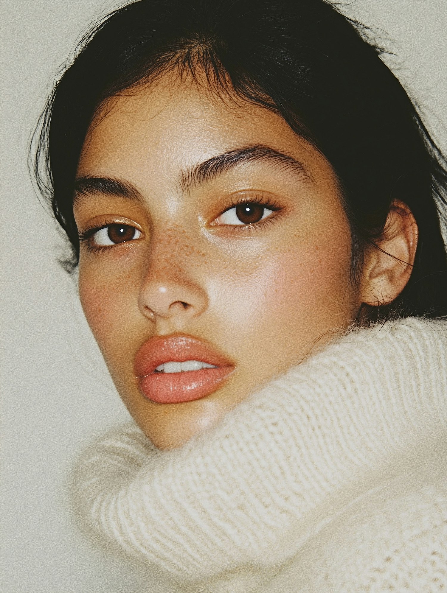 Close-up portrait of a young woman with dark hair, freckles, and a cream turtleneck, exuding natural beauty and elegance.