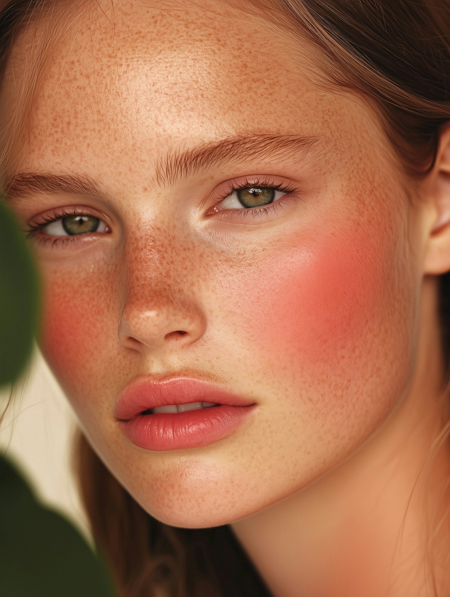 Close-up portrait of a freckled woman with green eyes and rosy cheeks, highlighting natural beauty and soft lighting.