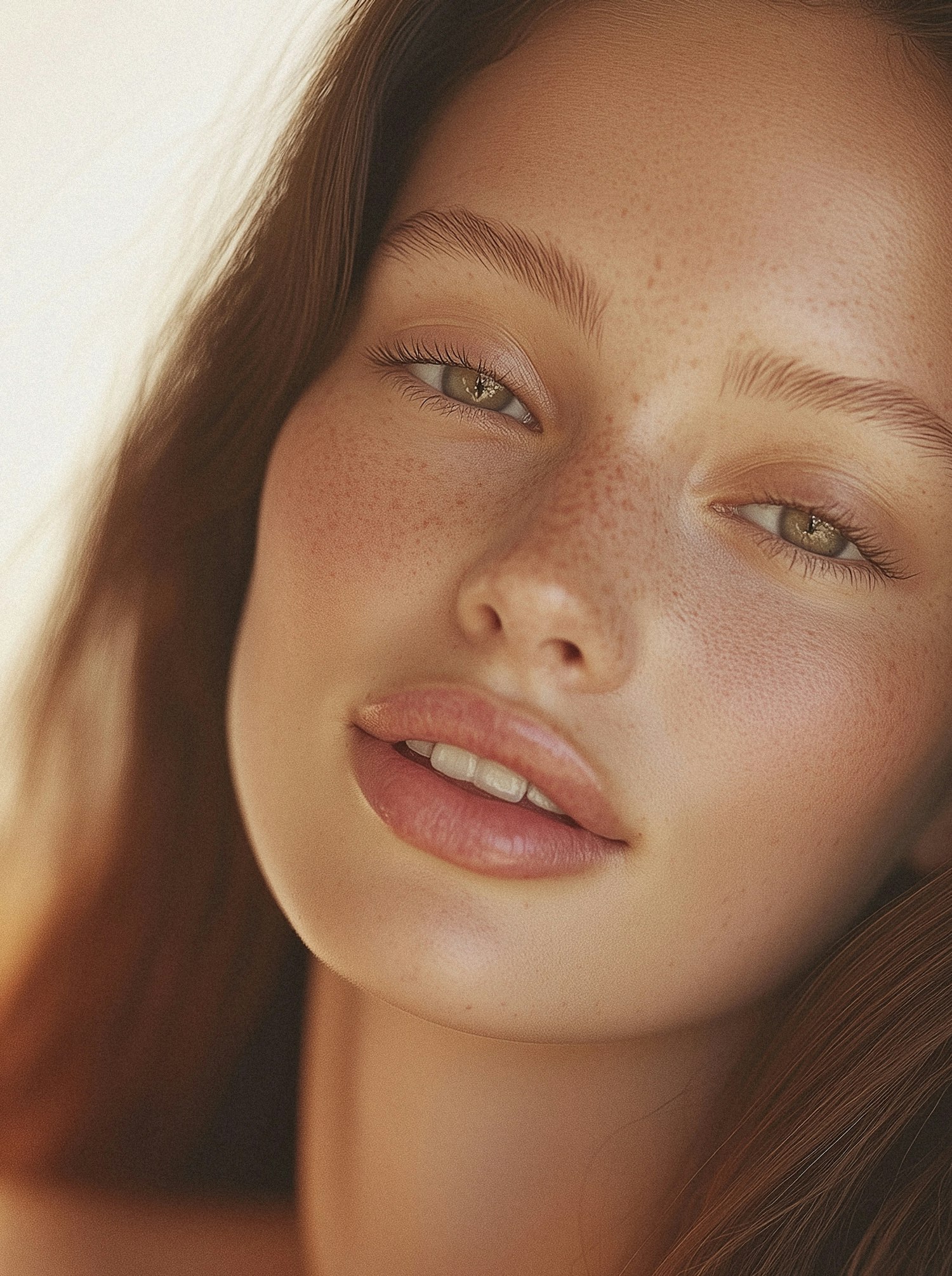 Close-up portrait of a young woman with freckles, light green eyes, and long brown hair, captured in soft, warm lighting.