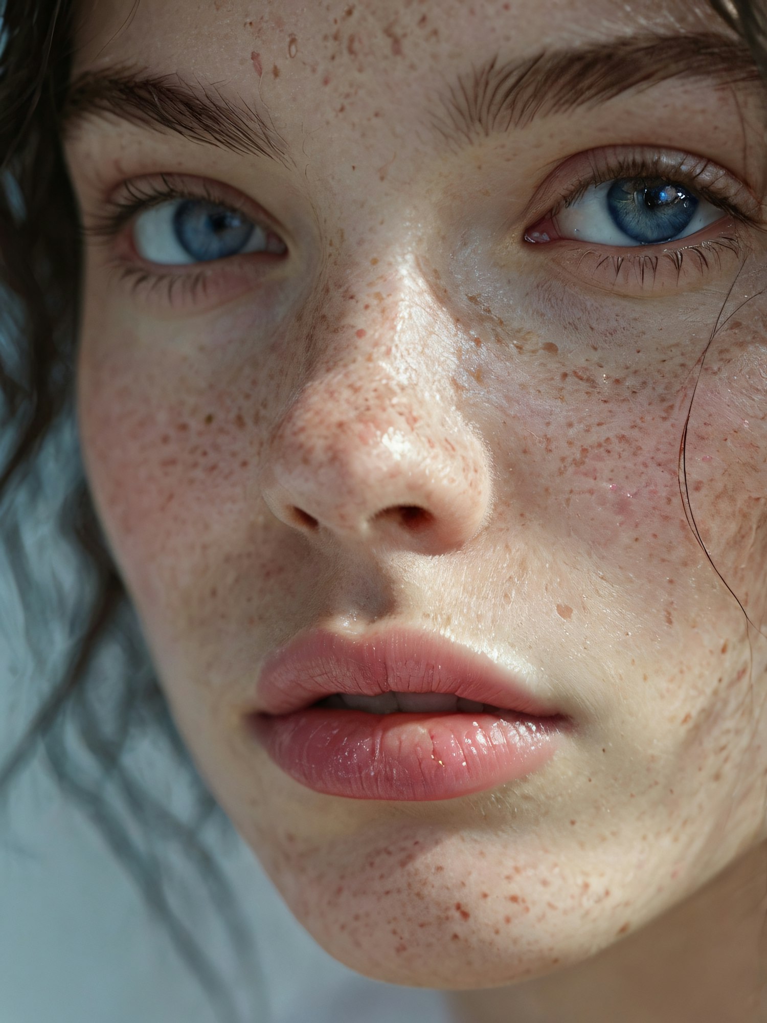 Close-up of a young woman with blue eyes, freckles, and full lips, showcasing natural beauty and skin texture.