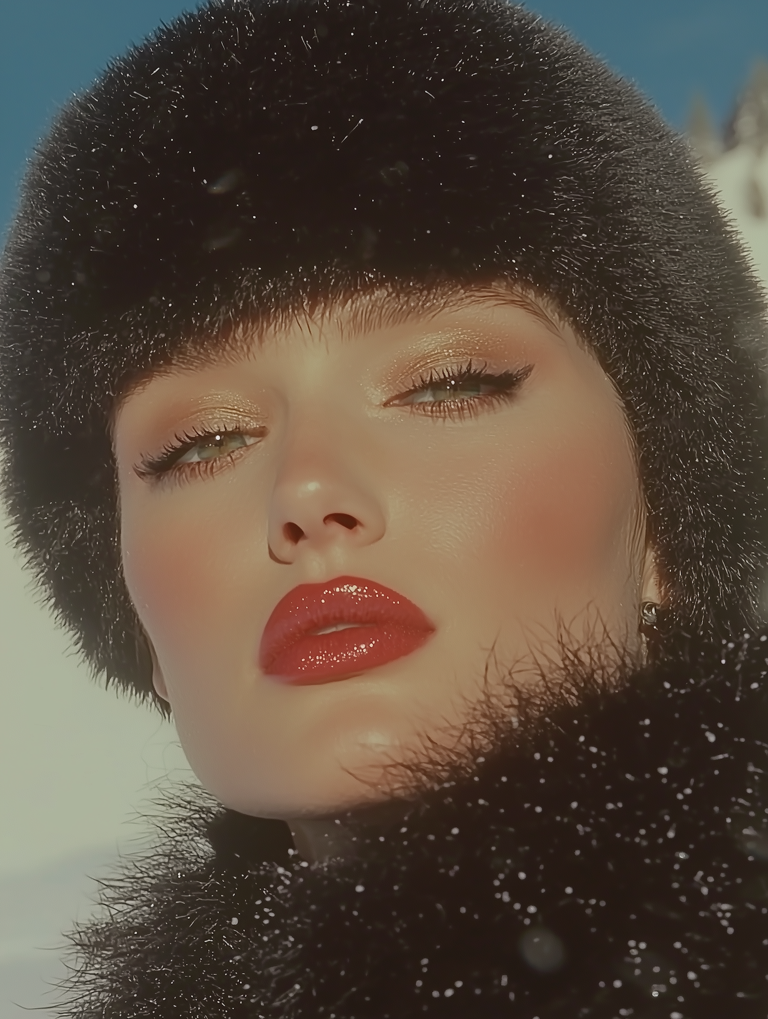 Close-up of a woman in a black fur hat and coat, with red lips and green eyes, set against a bright blue sky.