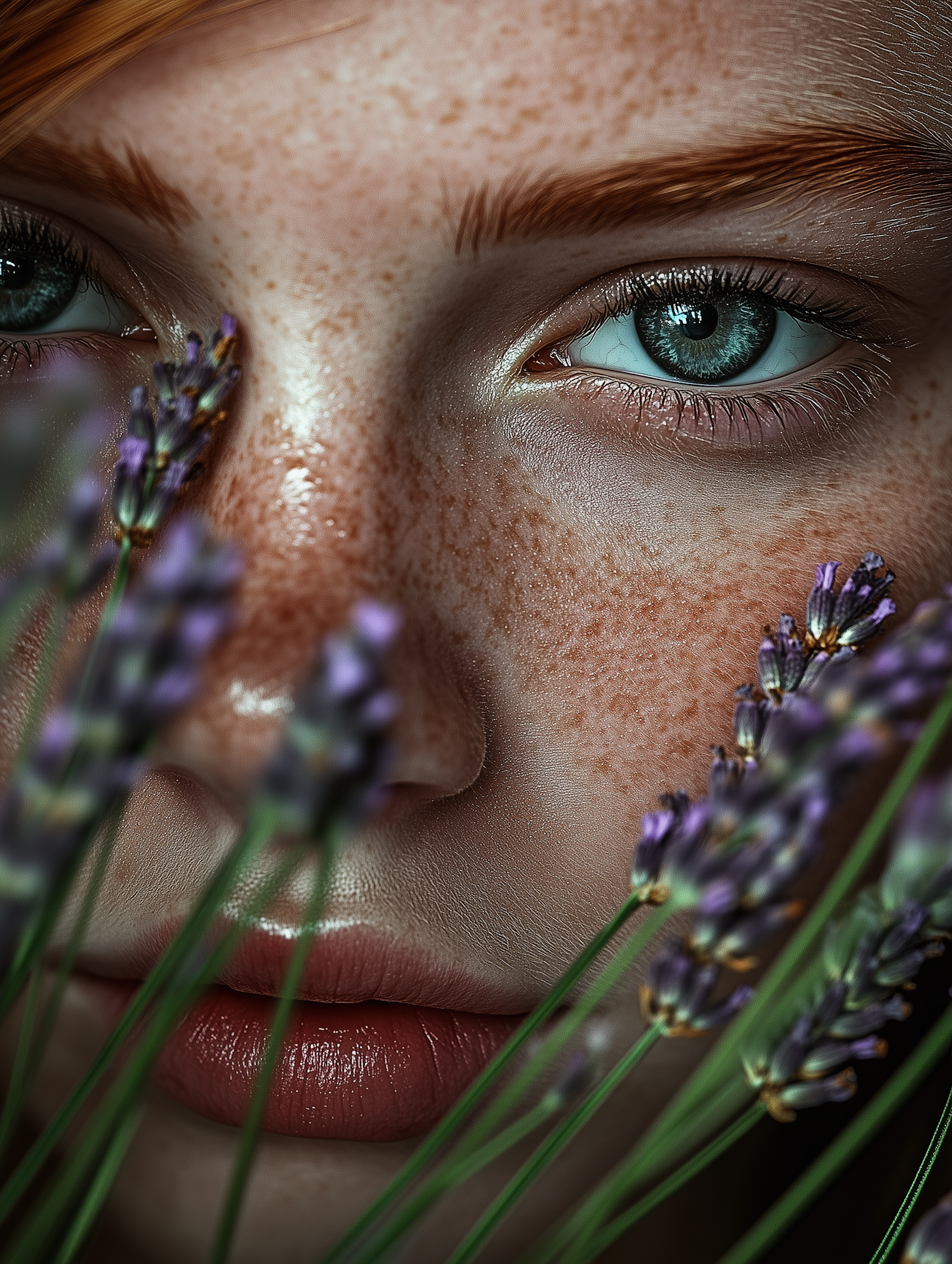 Close-up of a freckled woman with blue eyes and lavender flowers, highlighting natural beauty and serene expression.
