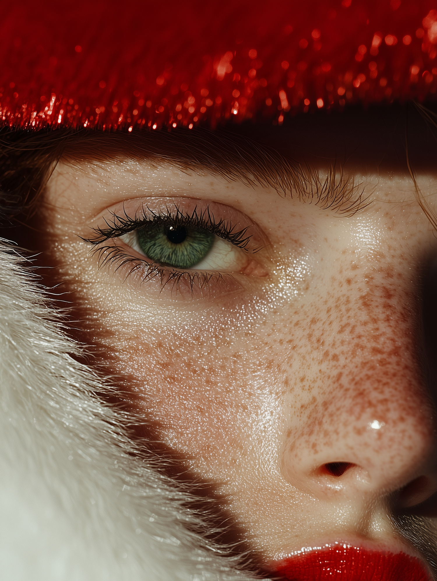 Close-up of a freckled face with green eye, red lips, and a red hat. Vibrant colors and textures create a striking visual contrast.