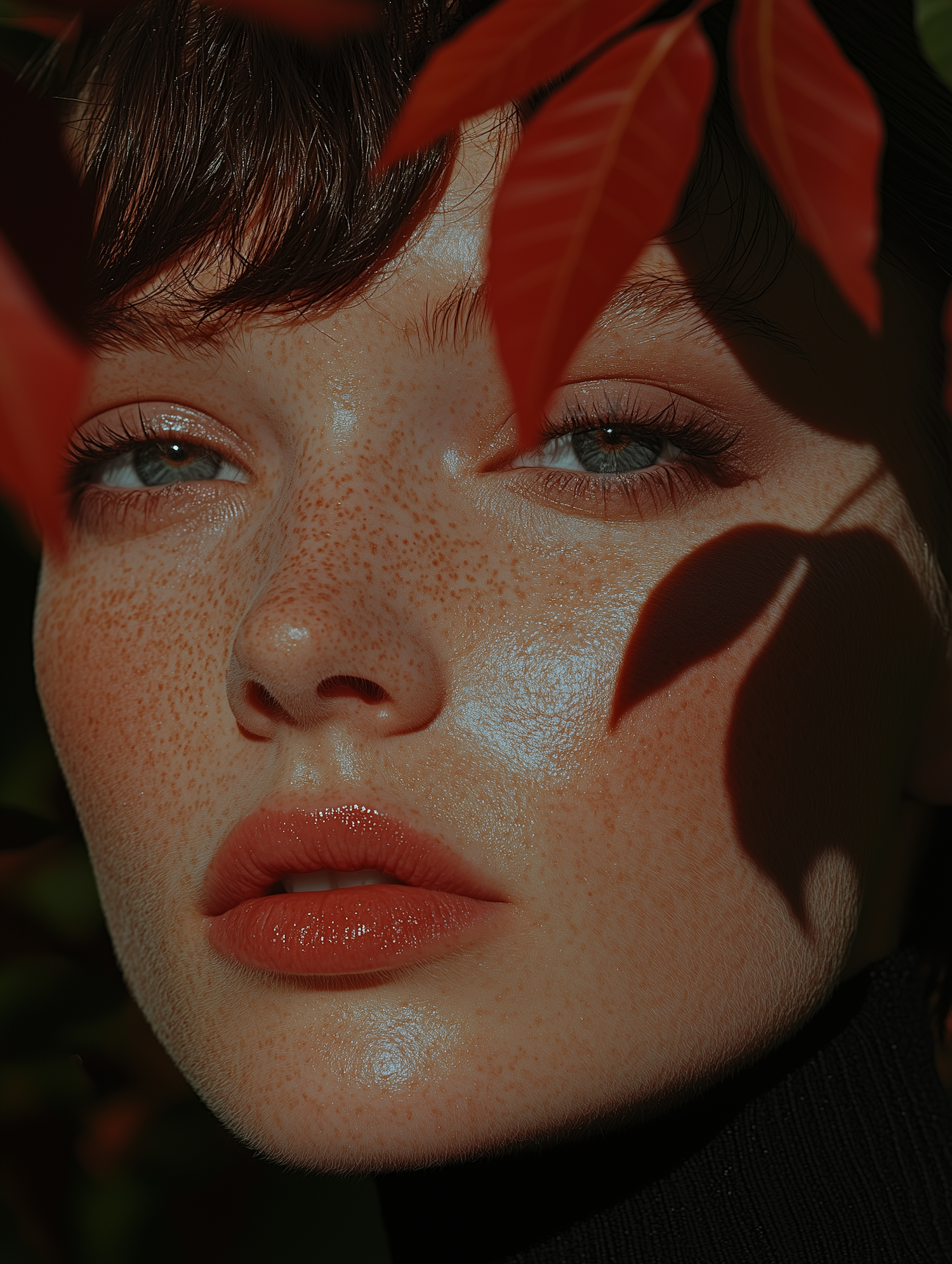 Close-up portrait of a freckled woman with blue eyes and glossy lips, framed by red leaves, creating an autumnal atmosphere.