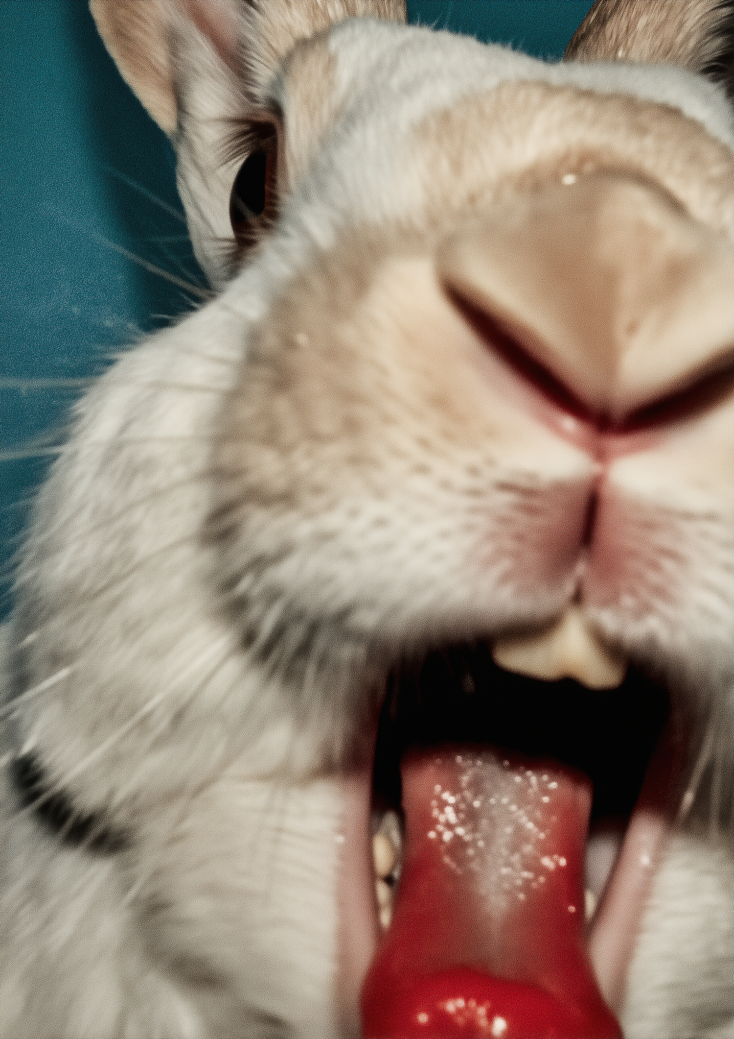 A close-up of a rabbit's nose, mouth, teeth, and tongue, showcasing its quirky expression with a blue background.